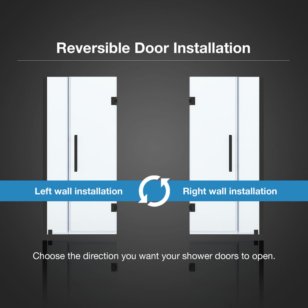 Frameless reversible door installation with built-in door magnet for a secure and tight close; no more leaks, no more wet floors