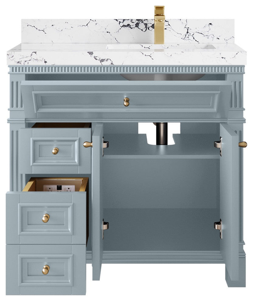 Willow Collection Paris 36 x 22 Right Offset Single Sink Bath Vanity in Blue Heather with 2" Straight/ Mitered Edge Viola NightThe Paris Collection is a stunning bathroom vanity that exudes artistry and quality craftsmanship. This premium vanity is made from solid Birch Wood and Plywood ( NO MDF and PRESSBOARD ) and features a dovetail joint that adds elegance to the contemporary design. You can choose between a single sink or double sink configuration to suit your needs, and the fluted side panels add more detail to the modern look. This vanity is sure to make a statement in any bathroom.FEATURES:1. Traditional style with a modern twist - made from Birch Wood and Plywood ( NO MDF and PRESSBOARD ), this bathroom vanity features a clean, contemporary design with soft-close hardware and antique brass hardware.2. Premium quartz or marble countertops - choose from a variety of colors to perfectly match your existing decor.3. Made from sustainable and eco-friendly Birch Wood and Plywood ( NO MDF and PRESSBOARD ), this product is a great way to provide your home with the comfort you deserve. The FSC certificate ensures that it meets strict environmental standards4. Plenty of storage space - this vanity comes with plenty of cabinet space to store all your bathroom essentials.5. Easy Carry - The cabinets are easy to carry because they come in 2 separate boxes. Countertop and cabinet, so you can just pick up the pieces without worrying about lifting heavy items!Details:Material: Birch Wood and Plywood ( NO MDF and PRESSBOARD )Finish Available: White, Fine Grain, Blue Heather and BlackNumber of Drawers: 3 Regular Drawers, 1 ShelfSink Installation: Under-mounted rectangle SINK(S)Hardware: Soft closing hinges and slider Hardware Finish: Brushed Gold FinishCabinet Width: 35 (in.)Cabinet Depth: 21-1/2 (in.)Countertop Width: 36 (in.) Countertop Depth: 22 (in.)Cabinet Height: 34 (in.)Countertop Height: 1.5 (in.) Double Cove Edge or 2 (in.) Straight/ Mitered EdgeCabinet Height with Top: 36 (in.)Backsplash Height: 4 (in.)Faucet: NOT IncludedFaucet Hole(S): Comes with SINGLE hole faucetVanity Countertops options: Mitered /Straight edge or Double Cove Edge (Pure White Quartz, Calacatta Laza Quartz, Calacatta Nuvo Quartz, Empira White Quartz, Carrara Marble, Carrara Quartz, Piatra Gray Quartz, Calacatta Black, Calacatta Gold, Venatino Quartz, Pearl Light Gray, Viola Brown, Viola Gold, Viola Night, Calacatta Sienna, 2" Calacatta Poanazzo, 3 CM Artic White)