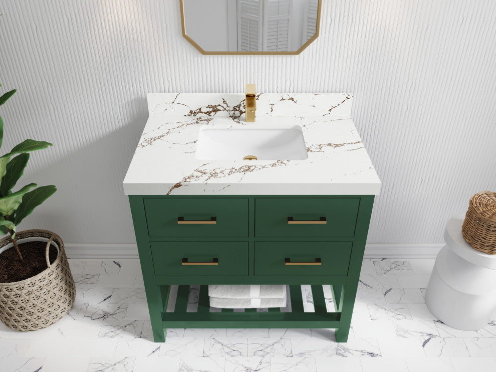 Willow Collection Parker 36 x 22 Single Sink Bath Vanity in Lafayette Green with 2" Straight/ Mitered Edge Viola Brown QuartzThe Parker vanity is a beautiful and modern addition to any bathroom. The sleek, spare design is perfect for a fresh and modern d�acor, and the top-quality materials and construction are sure to impress. The soft closing doors are a nice touch, and the generous storage space is perfect for all of your bathroom essentials. Whether you''re looking for a new centerpiece for your master bathroom or a guest powder room, the Parker vanity is sure to impress. Thanks to its high-quality construction, beautiful design, and ample storage space, this vanity is sure to become a treasured part of your home for years to come.Details:Material: Birch Wood and Plywood (NO MDF or PRESSBOARD) Finish Available: Navy Blue, Elephant Skin Gray, Lafayette Green, WhiteNumber of Drawers: 4 Regular Drawers, 1 Bottom ShelfSink Installation: Under-mounted rectangle SINK(S)Hardware: Soft closing hinges and sliderHardware Finish : GoldCabinet Width: 35 (in.)Cabinet Depth: 21-1/2 (in.)Countertop Width: 36 (in.) Countertop Depth: 22 (in.)Cabinet Height: 34 (in.)Countertop Height: 1.5 (in.) Double Cove Edge or 2 (in.) Straight/ Mitered EdgeCabinet Height with Top: 36 (in.)Backsplash Height: 4 (in.)Faucet: NOT IncludedFaucet Hole(S): Comes with SINGLE hole faucetVanity Countertops options: Mitered /Straight edge or Double Cove Edge (White Quartz, Calacatta Laza Quartz, Calacatta Nuvo Quartz, Carrara Quartz, Empira Quartz, Carrara Marble, Piatra Gray Quartz, Pearl Light Gray Quartz, Venatino Quartz, Calacatta Gold Quartz, Calacatta Black Quartz, Calacatta Nuvo Quartz)
