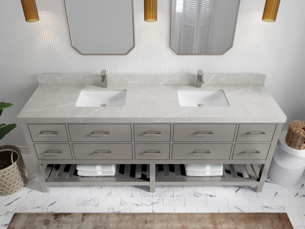Willow Collection Parker 84 x 22 Double Sink Bath Vanity in Elephant Skin Gray with 2" Straight/ Mitered Edge Pearl Gray QuartzThe Parker vanity is a beautiful and modern addition to any bathroom. The sleek, spare design is perfect for a fresh and modern decor, and the top-quality materials and construction are sure to impress. The soft closing doors are a nice touch, and the generous storage space is perfect for all of your bathroom essentials. Whether you''re looking for a new centerpiece for your master bathroom or a guest powder room, the Parker vanity is sure to impress. Thanks to its high-quality construction, beautiful design, and ample storage space, this vanity is sure to become a treasured part of your home for years to come.Details:Material: Birch Wood and Plywood (NO MDF or PRESSBOARD) Finish Available: Navy Blue, Elephant Skin Gray, Lafayette Green, White, Evergreen and BlackNumber of Drawers: 10 Regular Drawers, 1 Bottom ShelfSink Installation: Under-mounted rectangle SINK(S)Hardware: Soft closing hinges and sliderHardware Finish : GoldCabinet Width: 83 (in.)Cabinet Depth: 21-1/2 (in.)Countertop Width: 84 (in.) Countertop Depth: 22 (in.)Cabinet Height: 34 (in.)Countertop Height: 1.5 (in.) Double Cove Edge or 2 (in.) Straight/ Mitered EdgeCabinet Height with Top: 36 (in.)Backsplash Height: 4 (in.)Faucet: NOT IncludedFaucet Hole(S): Comes with SINGLE hole faucetVanity Countertops options: Mitered /Straight edge or Double Cove Edge (White Quartz, Calacatta Laza Quartz, Calacatta Nuvo Quartz, Carrara Quartz, Empira Quartz, Carrara Marble, Piatra Gray Quartz, Pearl Light Gray Quartz, Venatino Quartz, Calacatta Gold Quartz, Calacatta Black Quartz, Calacatta Nuvo Quartz)