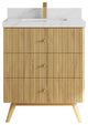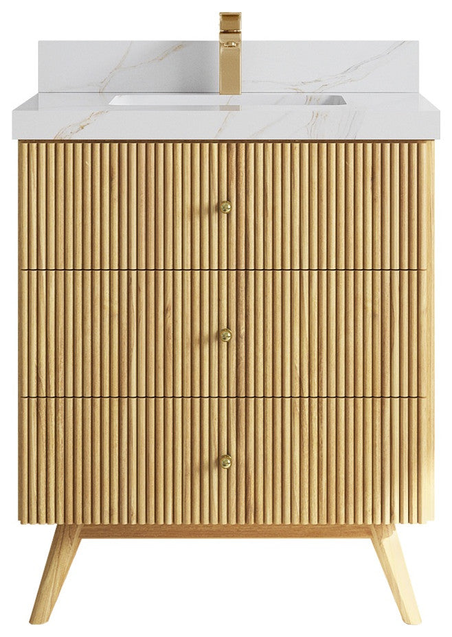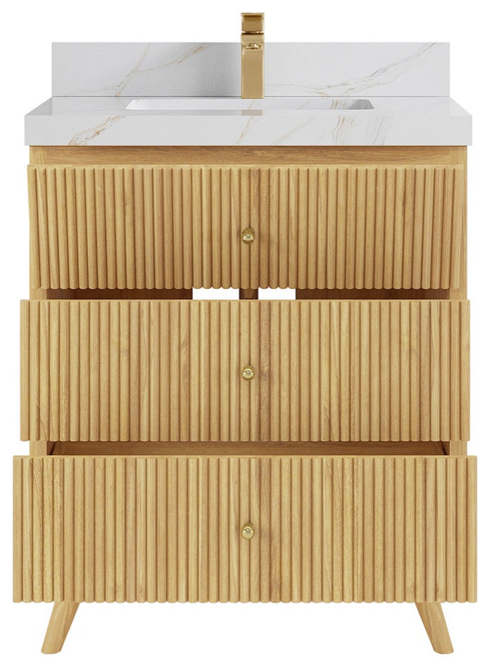 Willow Collection Pasadena 30 x 22 Single Sink Bath Vanity in Light Natural Teak with 2" Straight/ Mitered Edge Calacatta Sienna QuartzThe Pasadena collection open bathroom vanity is a stunning piece that will elevate the look of any modern bathroom. It is made of durable teak wood and features a reeded-fluted design with a touch of modernity. The textured wooden finish of the vanity perfectly complements any bathroom interior, while the open storage area adds a modern coastal touch. In addition to its stylish appearance, this vanity is also practical, with plenty of space to store all of your bathroom essentials. With its subtle yet eye-catching look, the Pasadena collection open bathroom vanity is a must-have for any bathroom renovation.The reeded design of this bathroom vanity adds a touch of sophistication and modernity to any bathroom.The soft close hardware ensures a smooth and quiet closure every time, adding a touch of luxury to the vanity.The natural teak wood construction is both durable and eco-friendly, making it a sustainable choice for any home.The vanity comes equipped with plenty of storage space, including brass hardware, to keep your bathroom essentials organized and out of sight.The premium thick quartz or marble countertops add a touch of elegance and durability to the vanity, making it a beautiful and practical addition to any modern or coastal-themed home.Details:Material: Teak WoodFinish Available: Light Natural TeakNumber of Drawers: 1 Tip-out drawer, 2 Regular DrawersSink Installation: Under-mounted rectangle SINK(S)Hardware Finish: GoldCabinet Width: 29 (in.)Cabinet Depth: 21-1/2 (in.)Countertop Width: 30 (in.) Countertop Depth: 22 (in.)Cabinet Height: 34 (in.)Countertop Height: 1.5 (in.) Double Cove Edge or 2 (in.) Straight/ Mitered EdgeCabinet Height with Top: 36 (in.)Backsplash Height: 4 (in.)Faucet: NOT IncludedFaucet Hole(S): Comes with SINGLE hole faucetVanity Countertops options: Mitered /Straight edge or Double Cove Edge (White Quartz, Calacatta Laza Quartz, Calacatta Nuvo Quartz, Carrara Quartz, Empira Quartz, Carrara Marble, Piatra Gray Quartz, Pearl Light Gray Quartz, Venatino Quartz, Calacatta Gold Quartz, Calacatta Black Quartz, Calacatta Nuvo Quartz)