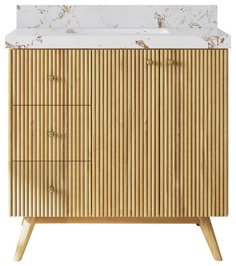 Willow Collection Pasadena 36 x 22 Center Single with Right Side Sink Bath Vanity in Light Natural Teak with 2" Straight/ Mitered Edge Viola GoldThe Pasadena collection open bathroom vanity is a stunning piece that will elevate the look of any modern bathroom. It is made of durable teak wood and features a reeded-fluted design with a touch of modernity. The textured wooden finish of the vanity perfectly complements any bathroom interior, while the open storage area adds a modern coastal touch. In addition to its stylish appearance, this vanity is also practical, with plenty of space to store all of your bathroom essentials. With its subtle yet eye-catching look, the Pasadena collection open bathroom vanity is a must-have for any bathroom renovation.The reeded design of this bathroom vanity adds a touch of sophistication and modernity to any bathroom.The soft close hardware ensures a smooth and quiet closure every time, adding a touch of luxury to the vanity.The natural teak wood construction is both durable and eco-friendly, making it a sustainable choice for any home.The vanity comes equipped with plenty of storage space, including brass hardware, to keep your bathroom essentials organized and out of sight.The premium thick quartz or marble countertops add a touch of elegance and durability to the vanity, making it a beautiful and practical addition to any modern or coastal-themed home.Details:Material: Teak WoodFinish Available: Light Natural TeakNumber of Drawers: 3 Regular Drawers, 1 ShelfSink Installation: Under-mounted rectangle SINK(S)Hardware Finish: GoldCabinet Width: 35 (in.)Cabinet Depth: 21-1/2 (in.)Countertop Width: 36 (in.) Countertop Depth: 22 (in.)Cabinet Height: 34 (in.)Countertop Height: 1.5 (in.) Double Cove Edge or 2 (in.) Straight/ Mitered EdgeCabinet Height with Top: 36 (in.)Backsplash Height: 4 (in.)Faucet: NOT IncludedFaucet Hole(S): Comes with SINGLE hole faucetVanity Countertops options: Mitered /Straight edge or Double Cove Edge (White Quartz, Calacatta Laza Quartz, Calacatta Nuvo Quartz, Carrara Quartz, Empira Quartz, Carrara Marble, Piatra Gray Quartz, Pearl Light Gray Quartz, Venatino Quartz, Calacatta Gold Quartz, Calacatta Black Quartz, Calacatta Nuvo Quartz)
