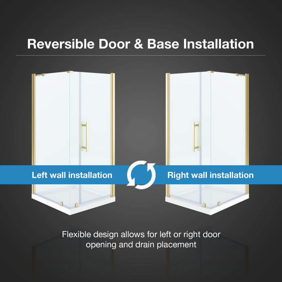 The OVE Decors Pasadena frameless pivot shower door kit offers the kind of sophisticated enclosure design that complements any and all bathroom styles. It has a full-length door-to-wall pivot door mechanism, with premium quality hardware in a brushed gold finish, and includes a 25 in. wide door panel, a 6 in. wide inline panel, a 33 in. wide side panel, and a 36 in. x 36 in. x 2 3/4 in. shower base, ideal for a corner installation. All glass door panels are made from premium 8mm (5/16) thick certified tempered glass and feature high quality magnetic door strips and engineered hardware that ensure smooth opening and closing and no leaks. The reversible shower pan has a subtle covered side drain design, is made of premium fiberglass-reinforced acrylic and has a slip-minimizing textured surface and easy-to-clean construction.