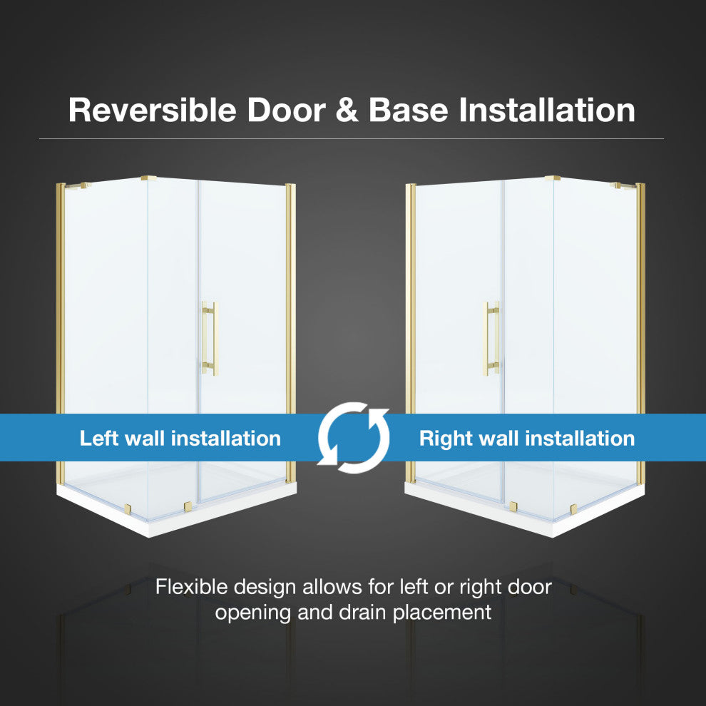 The OVE Decors Pasadena frameless pivot shower door kit offers the kind of sophisticated enclosure design that complements any and all bathroom styles. It has a full-length door-to-wall pivot door mechanism, with premium quality hardware in a brushed gold finish, and includes a 29 in. wide door panel, a 14 in. wide inline panel, a 33 in. wide side panel, and a 48 in. x 36 in. x 2 3/4 in. shower base, ideal for a corner installation. All glass door panels are made from premium 8mm (5/16) thick certified tempered glass and feature high quality magnetic door strips and engineered hardware that ensure smooth opening and closing and no leaks. The reversible shower pan has a subtle covered side drain design, is made of premium fiberglass-reinforced acrylic and has a slip-minimizing textured surface and easy-to-clean construction.