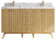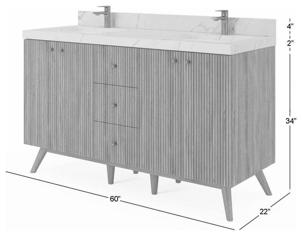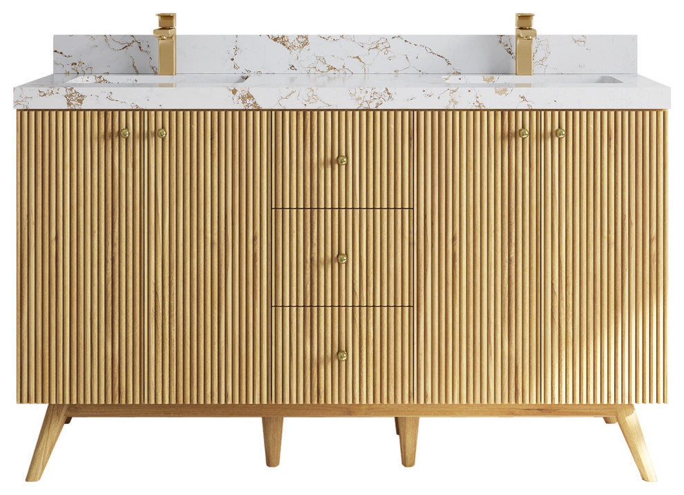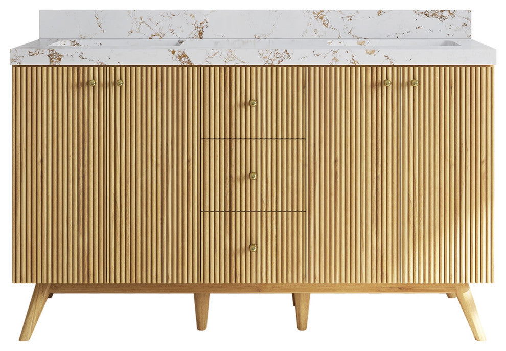 Willow Collection Pasadena 60 x 22 Double Sink Bath Vanity in Light Natural Teak with 2" Straight/ Mitered Edge Viola GoldThe Pasadena collection open bathroom vanity is a stunning piece that will elevate the look of any modern bathroom. It is made of durable teak wood and features a reeded-fluted design with a touch of modernity. The textured wooden finish of the vanity perfectly complements any bathroom interior, while the open storage area adds a modern coastal touch. In addition to its stylish appearance, this vanity is also practical, with plenty of space to store all of your bathroom essentials. With its subtle yet eye-catching look, the Pasadena collection open bathroom vanity is a must-have for any bathroom renovation.The reeded design of this bathroom vanity adds a touch of sophistication and modernity to any bathroom.The soft close hardware ensures a smooth and quiet closure every time, adding a touch of luxury to the vanity.The natural teak wood construction is both durable and eco-friendly, making it a sustainable choice for any home.The vanity comes equipped with plenty of storage space, including brass hardware, to keep your bathroom essentials organized and out of sight.The premium thick quartz or marble countertops add a touch of elegance and durability to the vanity, making it a beautiful and practical addition to any modern or coastal-themed home.Details:Material: Teak WoodFinish Available: Light Natural TeakNumber of Drawers: 3 Regular Drawers, 2 ShelvesSink Installation: Under-mounted rectangle SINK(S)Hardware Finish: GoldCabinet Width: 59 (in.)Cabinet Depth: 21-1/2 (in.)Countertop Width: 60 (in.) Countertop Depth: 22 (in.)Cabinet Height: 34 (in.)Countertop Height: 1.5 (in.) Double Cove Edge or 2 (in.) Straight/ Mitered EdgeCabinet Height with Top: 36 (in.)Backsplash Height: 4 (in.)Faucet: NOT IncludedFaucet Hole(S): Comes with SINGLE hole faucetVanity Countertops options: Mitered /Straight edge or Double Cove Edge (White Quartz, Calacatta Laza Quartz, Calacatta Nuvo Quartz, Carrara Quartz, Empira Quartz, Carrara Marble, Piatra Gray Quartz, Pearl Light Gray Quartz, Venatino Quartz, Calacatta Gold Quartz, Calacatta Black Quartz, Calacatta Nuvo Quartz)