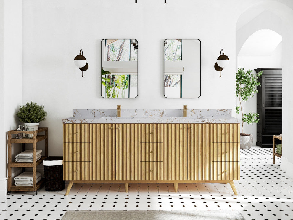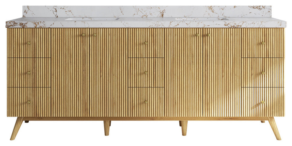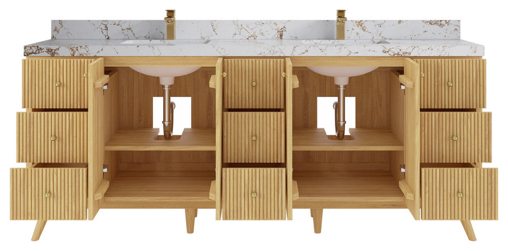 Willow Collection Pasadena 84 x 22 Double Sink Bath Vanity in Light Natural Teak with 2" Straight/ Mitered Edge Viola GoldThe Pasadena collection open bathroom vanity is a stunning piece that will elevate the look of any modern bathroom. It is made of durable teak wood and features a reeded-fluted design with a touch of modernity. The textured wooden finish of the vanity perfectly complements any bathroom interior, while the open storage area adds a modern coastal touch. In addition to its stylish appearance, this vanity is also practical, with plenty of space to store all of your bathroom essentials. With its subtle yet eye-catching look, the Pasadena collection open bathroom vanity is a must-have for any bathroom renovation.The reeded design of this bathroom vanity adds a touch of sophistication and modernity to any bathroom.The soft close hardware ensures a smooth and quiet closure every time, adding a touch of luxury to the vanity.The natural teak wood construction is both durable and eco-friendly, making it a sustainable choice for any home.The vanity comes equipped with plenty of storage space, including brass hardware, to keep your bathroom essentials organized and out of sight.The premium thick quartz or marble countertops add a touch of elegance and durability to the vanity, making it a beautiful and practical addition to any modern or coastal-themed home.Details:Material: Teak WoodFinish Available: Light Natural TeakNumber of Drawers: 9 Regular Drawers, 2 ShelvesSink Installation: Under-mounted rectangle SINK(S)Hardware Finish: GoldCabinet Width: 83 (in.)Cabinet Depth: 21-1/2 (in.)Countertop Width: 84 (in.) Countertop Depth: 22 (in.)Cabinet Height: 34 (in.)Countertop Height: 1.5 (in.) Double Cove Edge or 2 (in.) Straight/ Mitered EdgeCabinet Height with Top: 36 (in.)Backsplash Height: 4 (in.)Faucet: NOT IncludedFaucet Hole(S): Comes with SINGLE hole faucetVanity Countertops options: Mitered /Straight edge or Double Cove Edge (White Quartz, Calacatta Laza Quartz, Calacatta Nuvo Quartz, Carrara Quartz, Empira Quartz, Carrara Marble, Piatra Gray Quartz, Pearl Light Gray Quartz, Venatino Quartz, Calacatta Gold Quartz, Calacatta Black Quartz, Calacatta Nuvo Quartz)