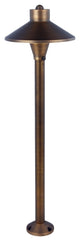 Inspired by the species of brightly-colored mushrooms, Chanterelle path lights create the perfect mood lighting for your evening stroll. The die-cast brass frame in an antique-brass finish features an eight-inch spike for stability. With matching brass shade, the entire fixture stands 24 inches tall and requires a 20-watt G4 halogen bulb (not included). Ideal for brightening a dark driveway, front entrance, or a garden path.