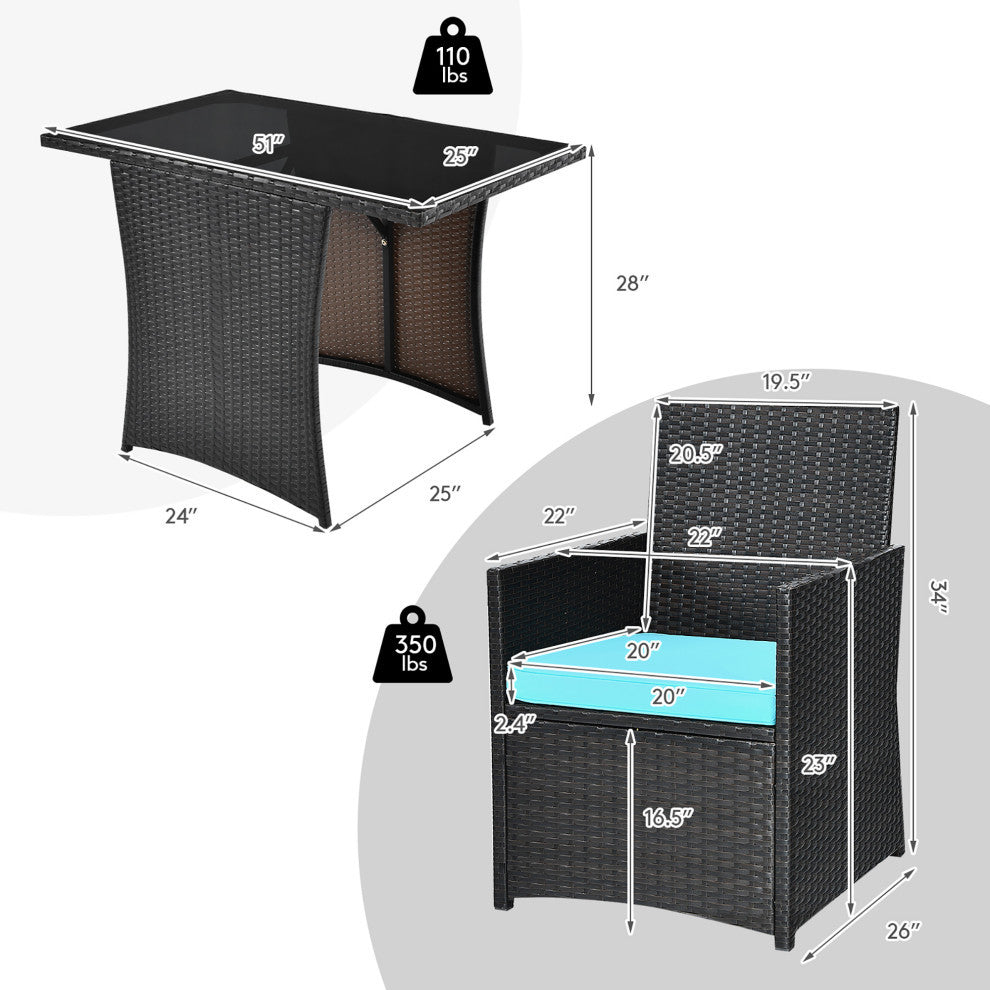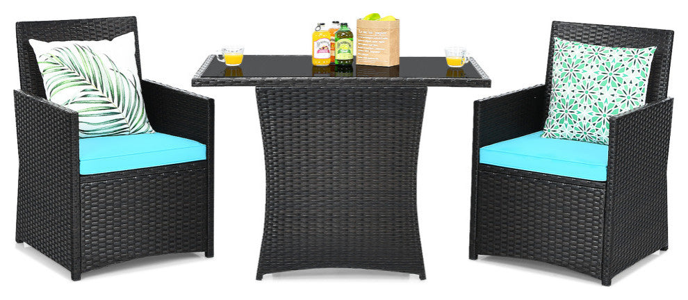 With curved backrests, comfy armrests and soft cushions, this outdoor bistro set provides optimal comfort for outdoor relaxation. Considering the changeable weather, this patio dining set is constructed of anti-rust steel frame and all weather PE rattan. If you accidentally spill a drink on the table or cushions, don''t worry. The smooth tabletop with sturdy tempered glass is easy to clean. And the cushion covers with zipper design can be detachable for easy maintenance. After using it, you are able to store 2 chairs under the table to save your outdoor space.