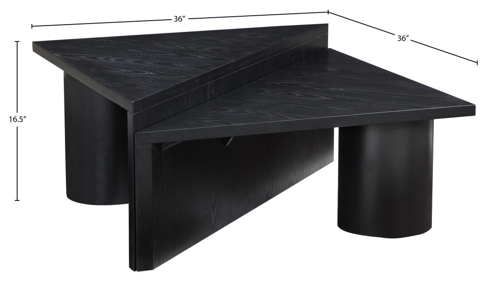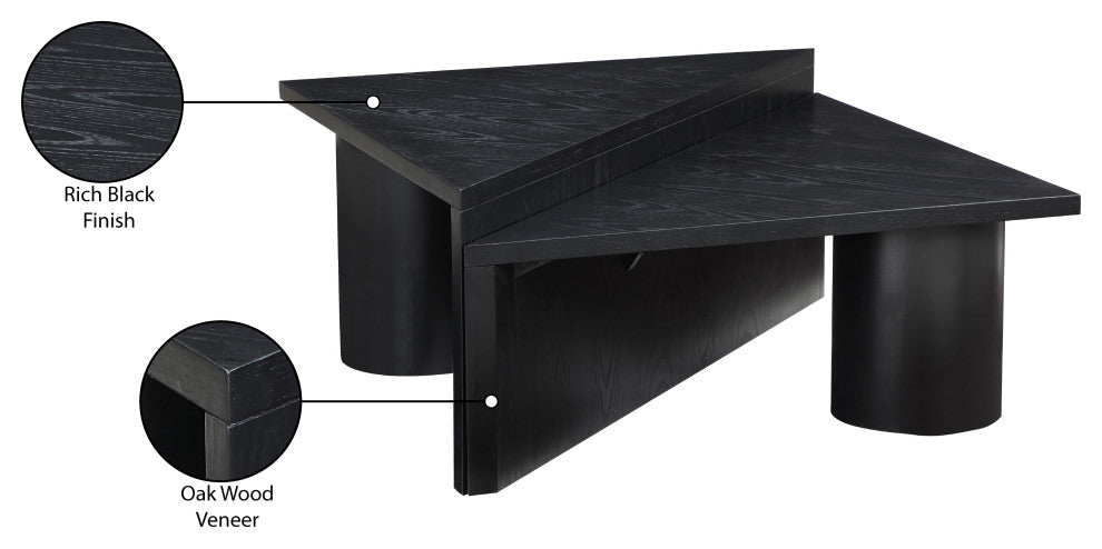 Inject bold, modern styling into your living space with this Pavillion Coffee Table. The striking blend of a rich black finish and oak wood veneer exudes elegance and durability. This design is composed of two distinct tables that can be placed together for a cohesive, eye-catching centerpiece. The versatile styling options of this coffee table allow you to personalize it to your liking and create a unique look that complements your decor. With its sleek, modern styling and sturdy construction, this coffee table is sure to become the focal point of any living space.Overall Product Dimensions: 36" W x 36" D x 16.5" HRich Black FinishOak Wood VeneerBoth Pieces IncludedLower Table Height: 13.5"Mid Century DesignNatural Wood Grain Variation - No Item has the same grain finish or wood knots due to natural factors.