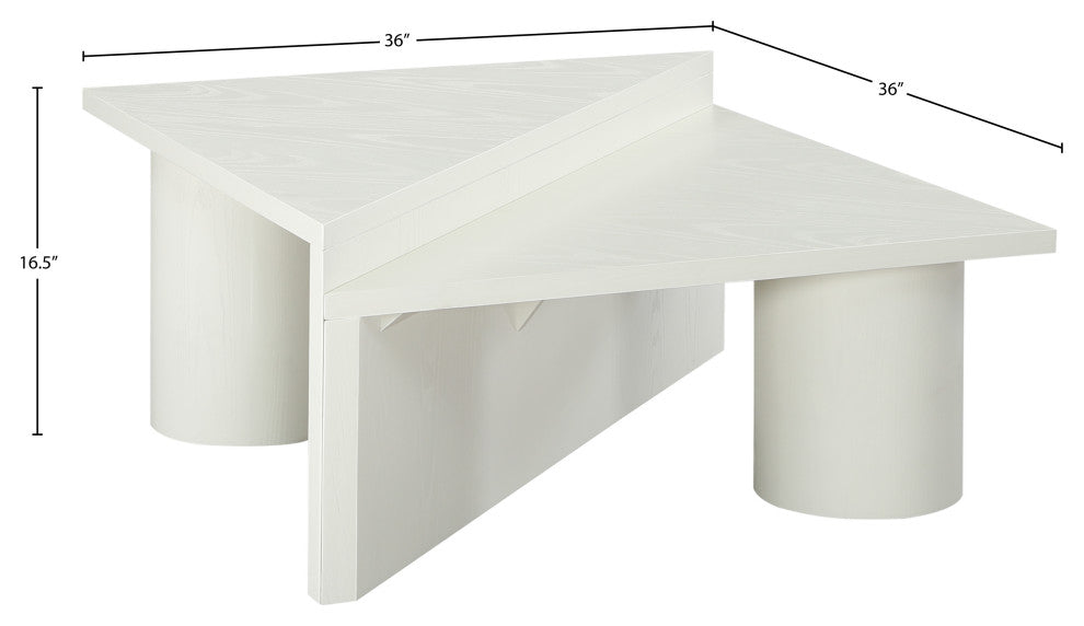 Inject bold, modern styling into your living space with this Pavillion Coffee Table. The striking blend of a rich white finish and oak wood veneer exudes elegance and durability. This design is composed of two distinct tables that can be placed together for a cohesive, eye-catching centerpiece. The versatile styling options of this coffee table allow you to personalize it to your liking and create a unique look that complements your decor. With its sleek, modern styling and sturdy construction, this coffee table is sure to become the focal point of any living space.Overall Product Dimensions: 36" W x 36" D x 16.5" HRich White Wash FinishOak Wood VeneerBoth Pieces IncludedLower Table Height: 13.5"Mid Century DesignNatural Wood Grain Variation - No Item has the same grain finish or wood knots due to natural factors.