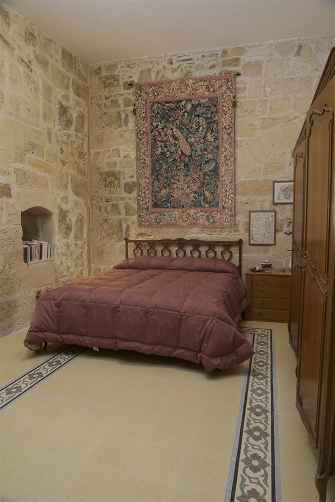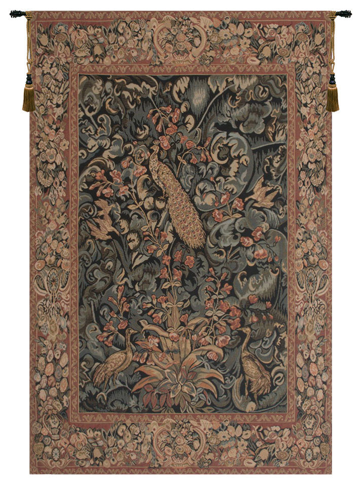 Peacock Tawoos tapestry depicts a scene where we see a peacock in an elaborate floral scene. The detailed leaves and flowers in the scene is a specific type of verdure that was found in the Oudenarde region of Belgium. The leaves are Aristolachia or cabbage leaves used in their works, for their beauty of their shapes as well as their dense greens. The peacock and peahens in this piece form a celebratory mural of flora and fauna.
