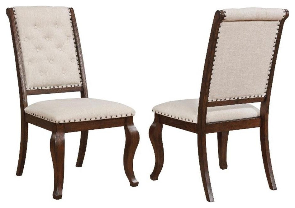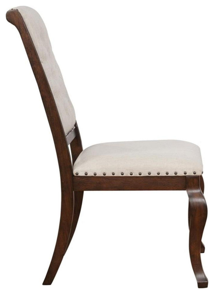 Antique java finish is a beautiful choice for this exceptional transitional dining side chair from the collection. Beautiful in any dining room, the chair offers a semi-formal, indulgent look with an upholstered, tufted back. Traced in nailhead trim, its seat is beautifully cushioned to deliver optimal comfort. Curvy front legs in an antique java finish catch the eye and contribute a touch of softness. A perfect complement to the dining table (sold separately).Features: • Upholstery: Cream fabric • Wood finish: Antique Java • Materials: Asian hardwood, fabric • A transitional dining collection featuring a traditional design and with modern glamorous details • Chairs with foam padded cushioning in elegant button tufted fabric upholstery and nailhead accents • Refreshing deep finish in antique java • Cushioned seating: For ultimate comfort and support • Seat construction: Seat frame • Cushion seat base: Pirelli webbing seat • Leveler/plastic glide: Plastic glideSpecifications: • Product Dimensions: 41.25" H x 22" W x 28.25" D • Seat Dimensions: 19.25" H x 19" W x 19.5" D • Product Weight: 17.64lbs • Assembly Required: Yes