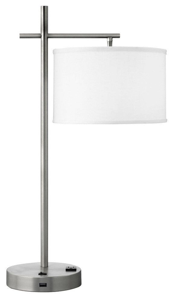 Standard Lamp Specifications for #UW806:Product Type: Single Nightstand LampHeight: 26"Finish: Brushed SteelConstruction: SteelSocket: (1) Aluminum On/Off Med. Base Type A 100W Max socket(s). (Bulb not included)Switching: (1) On/Off Rocker switch(es) located on the base.Cord: 6''5'' (from base) long black 16 gauge cord set with a 3 prong grounded plug.Electrical Outlet: (1) 3 prong grounded outlet(s).Data Port: None.USB Port: (1) 10W/2A USB port(s).UL/CUL and/or ETL listed: YesStandard Packing: 2 per carton (shade packed separately).Lamps & Shades per SKU: 2Lamping: (1) Aluminum On/Off Med. Base Type A 100W Max socket(s).Shade Size and Description: White fabric laminated to styrene hardback drum with self fold trim measuring 10" x 10" x 7.5" w/ .5" drop (Top x Bottom x Slant).Bulb Included: NoMaterial Description: constructed from polished, plated, and lacquered steel.