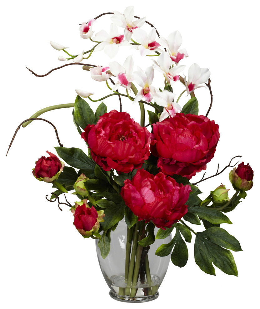 This exquisite Peony and Dendrobium arrangement projects a perfect harmony of color and design. The bright, tasteful, and colorful weaving of different textures and flower types creates a splendor that''s simply not found in a single species. Standing at over 21 inches high and set in a glass vase with liquid illusion faux water, this makes the perfect addition to any home or office, and also makes a great gift.