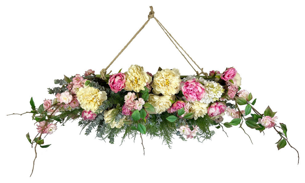 Add a unique and stylish touch to any outdoor space with this beautiful Peony, Cherry Blossom and Eucalyptus Chandelier! Perfect for any outdoor space, wedding banquets, events, and home dining areas, this gorgeous hanging faux floral chandelier can transform any space into something truly special. Installation is a snap - no maintenance required - so all you have to do is hang it up and enjoy the beauty of this one-of-a-kind chandelier. For those with an eye for beauty, it"™s the perfect addition to any setting! So don"™t wait - get your own Peony, Cherry Blossom and Eucalyptus Chandelier now and feel like royalty in your own backyard. Now what are you waiting for? Hang it up and get ready to impress your guests today!