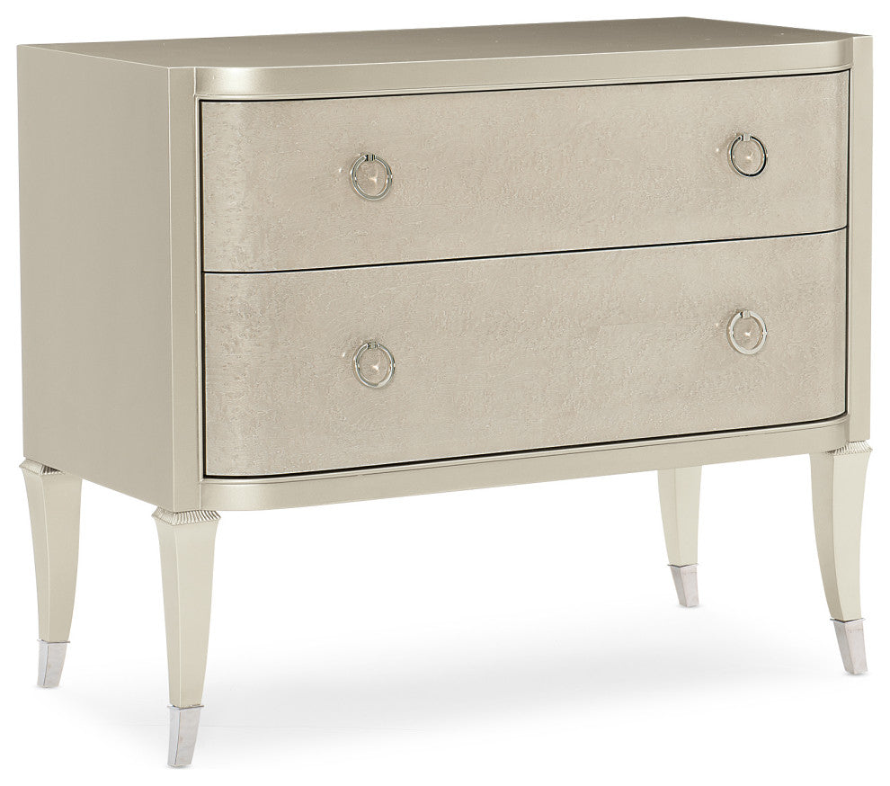 With effortless elegance, this sophisticated nightstand makes the perfect mate for any stylish bed. Designed to keep nighttime essentials close at hand, it wears a Soft Silver Paint finish and offers two drawers with painted interiors in the same soothing hue. Each drawer face is accentuated by an exquisite Smoked Birdseye finish complemented by shimmering, jewelry-like ring pulls while metal ferrules in Polished Stainless Steel cap its gently curved legs.