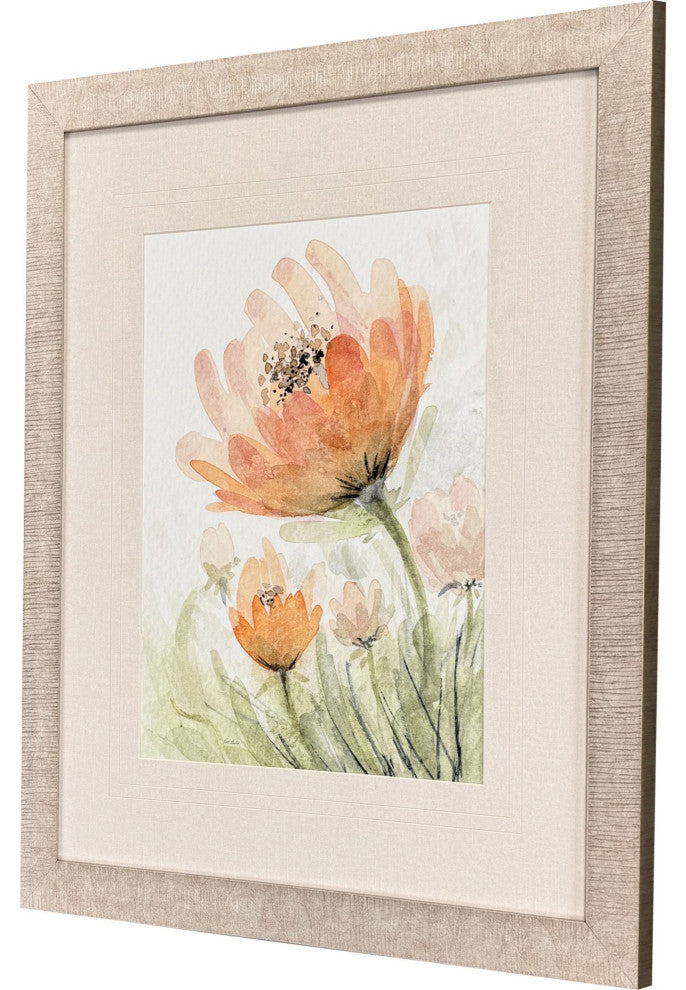 Beautiful poppies feature premium matting and v-groove details. Framed in a flat profile champagne gold finish with antique distressing.