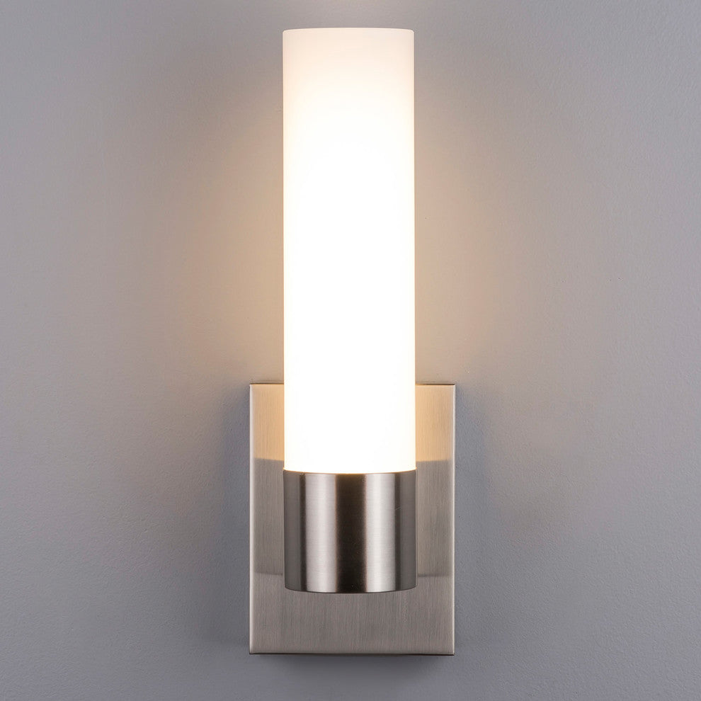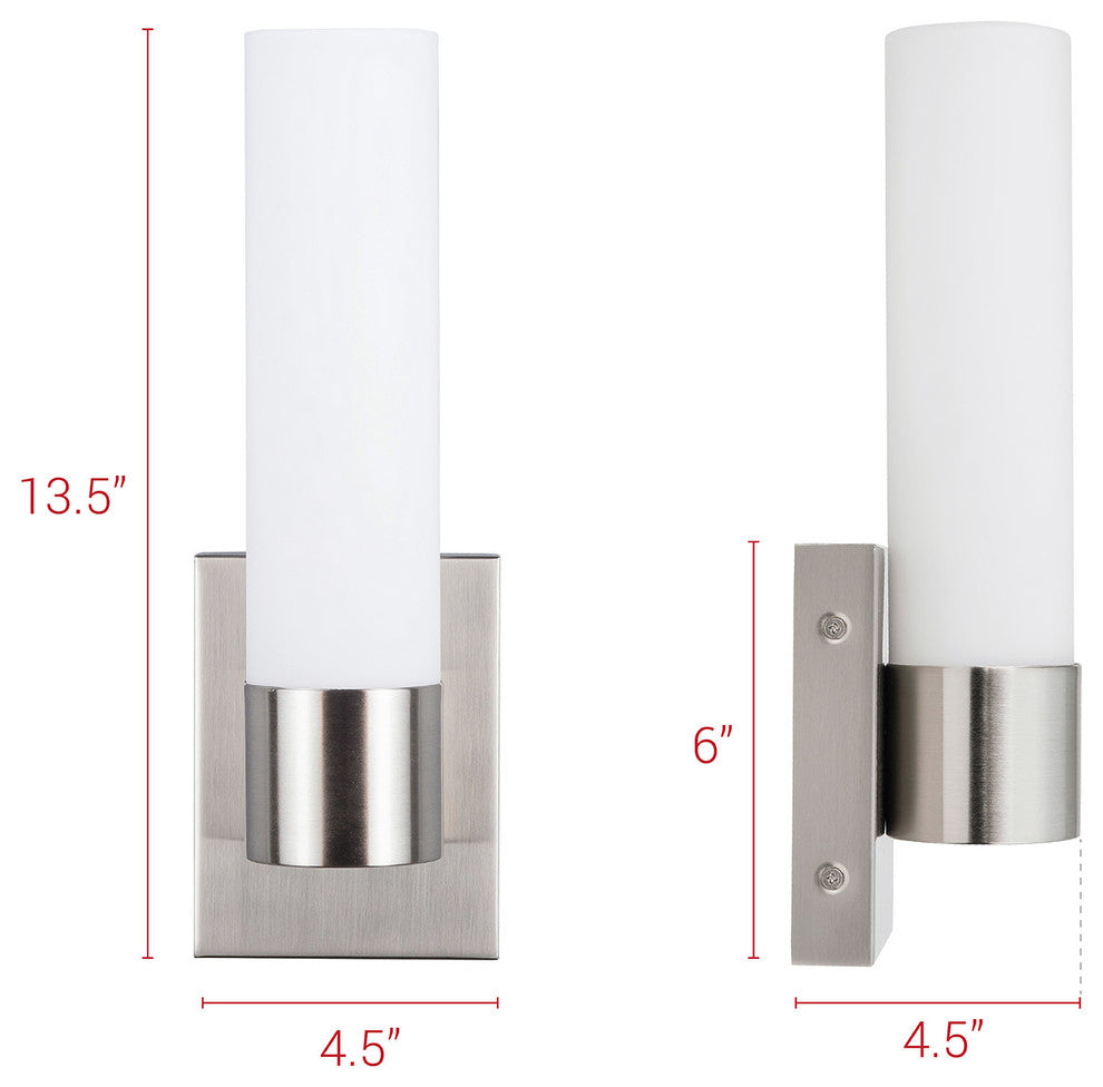 The Perpetua Vanity LED Wall Sconce, made by Linea di Liara, brightens any room with its striking contemporary design that features a frosted glass cylinder gracefully nestled into a polished chrome or brushed nickel housing. Perfect for baths, entryways and hallways.- 13.5" high x 4.5" wide, extends 4.5" from the wall. Backplate is 4.5" wide x 6" high- 3000K color temperature gives a soft white glow (integrated LED bulb). Light output greater than a 75W bulb, and dimmable with an electronic low voltage dimmer (ELV) switch. LED''s offer up to 50,000 hours of lifespan, are extremely durable and offer safety and environmental benefits- Features a universal mounting plate compatible with most 4" octagonal, round and square or 2" x 4" junction boxes (must be hardwired, installation by a licensed electrician recommended)- This Linea di Liara product is ETL listed and certified to CSA C22.2. Suitable for damp locations, and backed by a 1 year limited manufacturer''s warranty