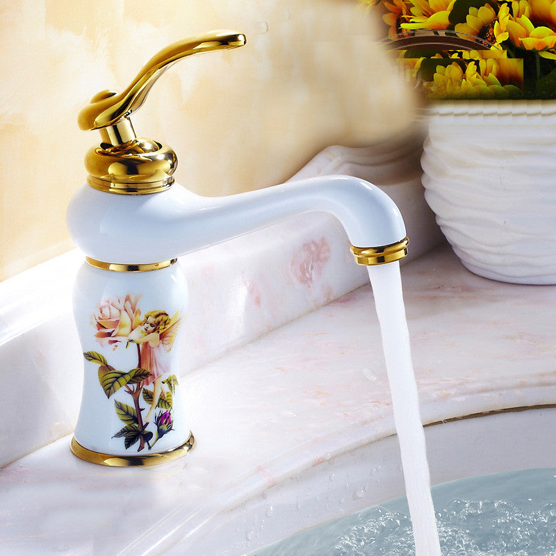 The Perpignan Bathroom Sink Faucet is a Single Handle Faucet that comes in Gold & White Finish along with a Hot/Cold Water Mixer. The Perpignan Single Handle Gold Finish Bathroom Sink Faucet is Deck-Mount and requires Single hole for Installation. The Perpignan Single Handle Gold Finish Bathroom Sink Faucet is having a Ceramic Valve core and is made of Brass.