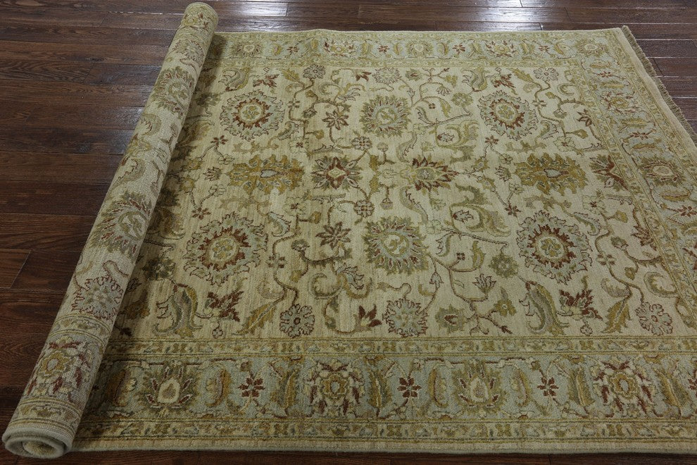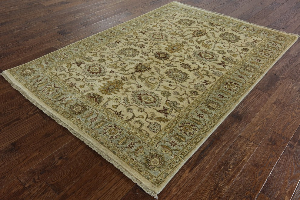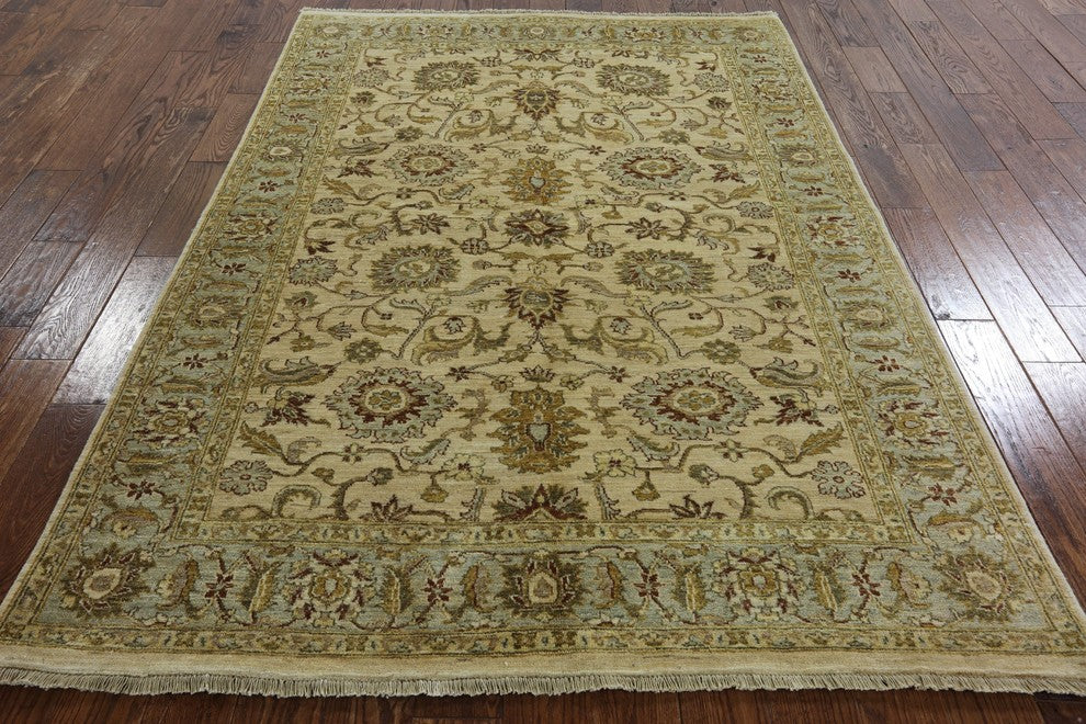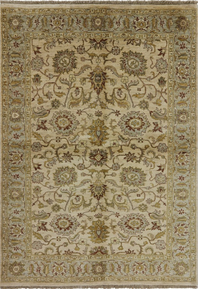 Peshawari Chobi Ivory Floral Oushak Style Hand-Knotted Wool Rug, 6'x8'