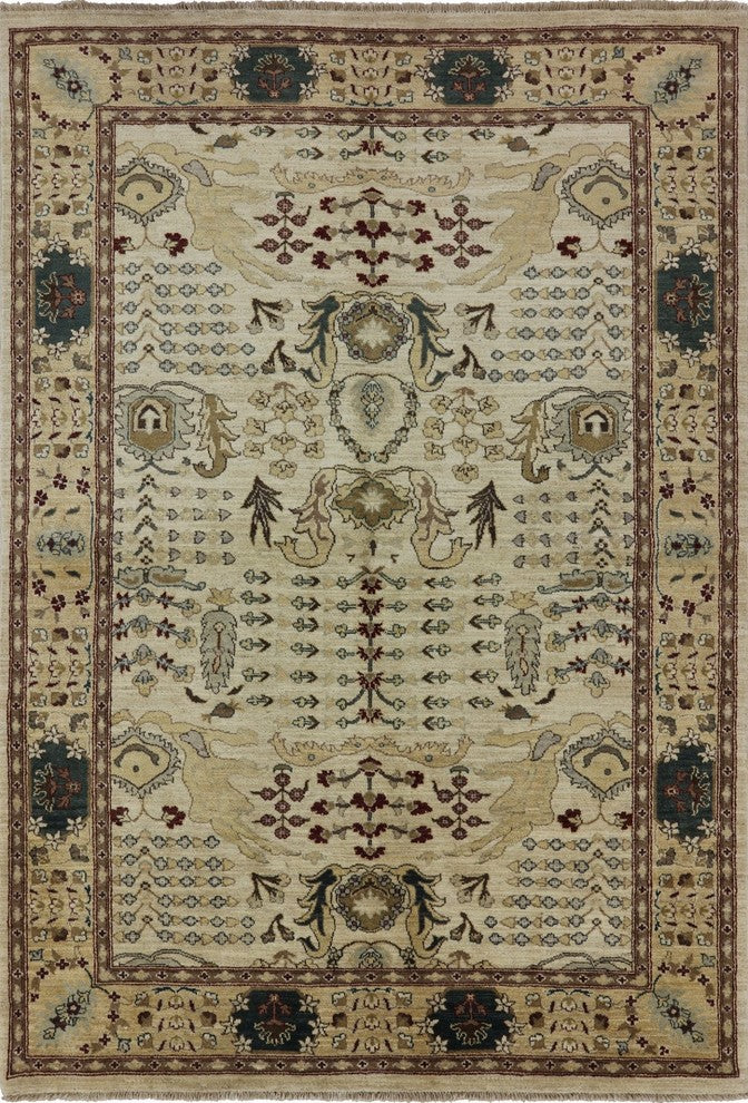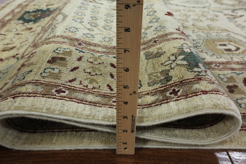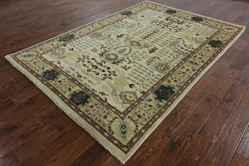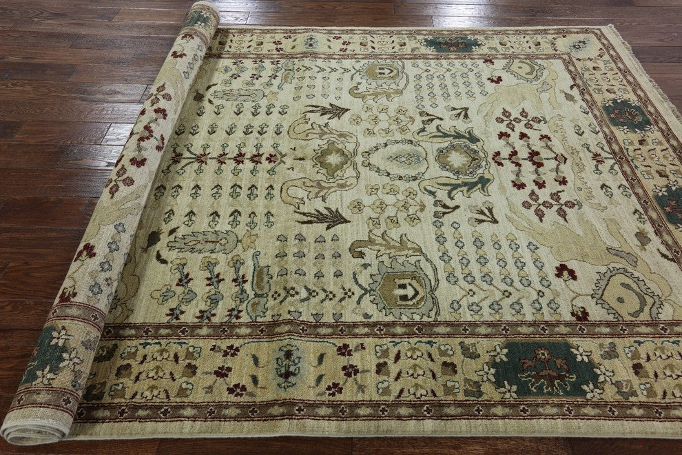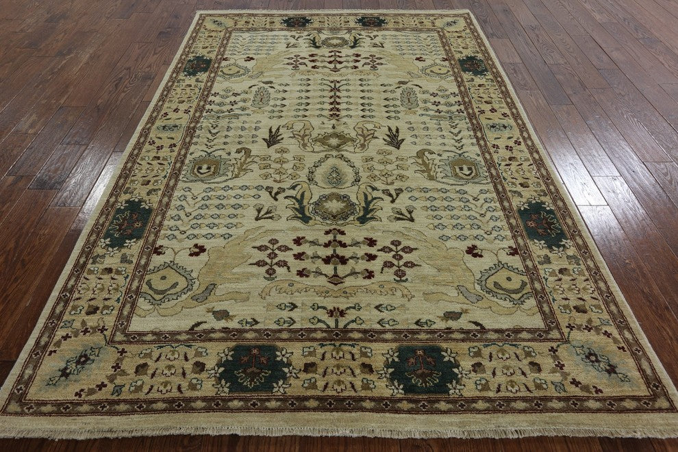 Peshawari Chobi Ivory Floral Oushak Style Hand-Knotted Wool Rug, 6'x9'