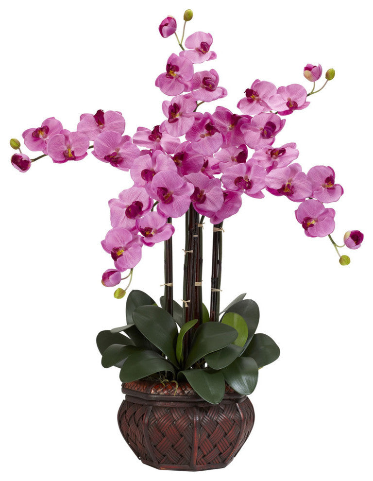 Our Phalaenopsis with vase is an elegant and exotic plant. Rich pastel colors easily add a touch of Asian beauty to any setting. Hard to pronounce but even harder to not admire, the 31 inch high Phalaenopsis resembles a miniature tree thus enhancing its already delicate look. Set atop a bed of green and a tasteful island inspired vase, this delicate looking flower lasts forever with no watering ever!