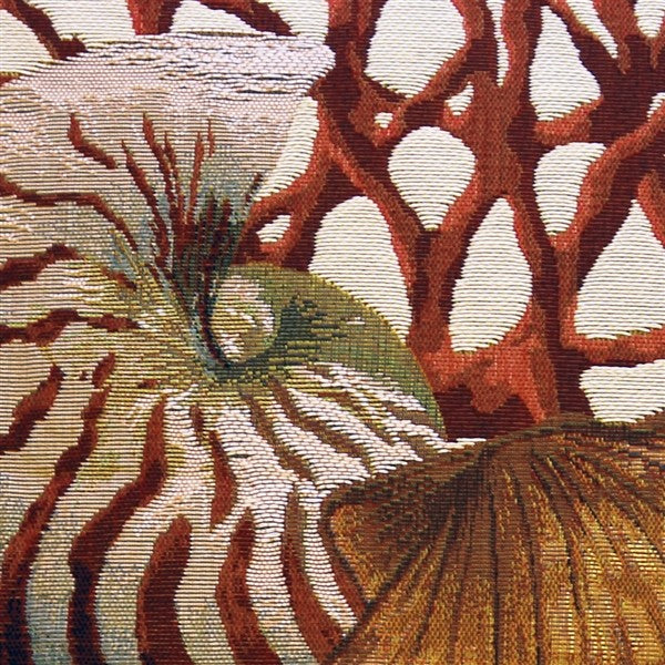 Bring the ocean into your home with this coral and shells nautical theme pillow in genuine French tapestry. The background color is a beautiful white sand color, while the shells and coral are in warm brown, sienna and cream tones. The pillow is backed with a durable cotton canvas in a matching rust color. A perfect pillow for a beach house, seaside cottage or any home looking for the lure of the ocean.