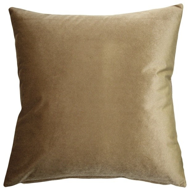 This is a light sable or deep tan 16x16 inch velvet throw pillow that bridges brown and gold tones. The Corona Velvet pillows are made from an exceptionally soft, medium-pile velvet fabric with a medium sheen.