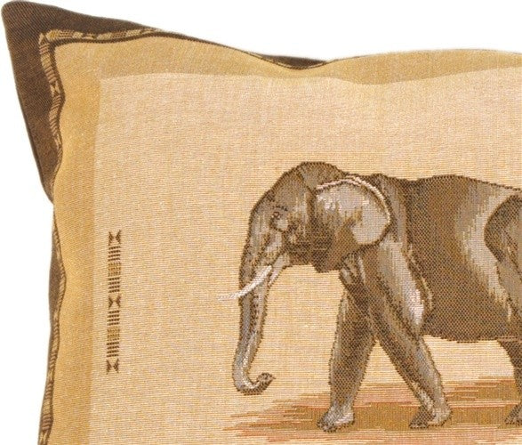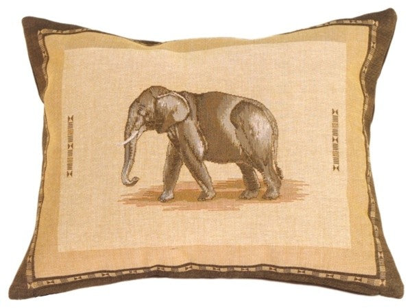 This rectangular pillow features an elephant bordered by an African motif banner.Features:-15" x 19"-French tapestry-Ultra Suede back in sable-Concealed zipper-Dry clean only-Filling: 100% Polyfill • Pillow dimensions always refer to the pillow cover''s width and length while lying flat unstuffed and are rounded up to the nearest whole inch.