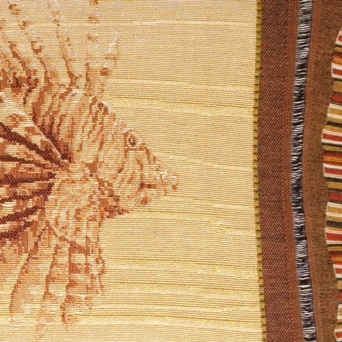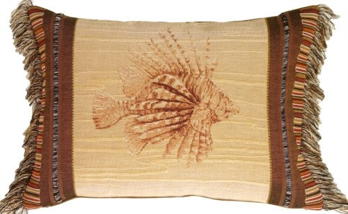 This wonderful rectangular pillow features a richly detailed lion fish set against a neutral background framed by a chocolate brown striped border and a simple black, white and brown fringe. The rich earth tones give this tropical fish a sophisticated and original touch.Features:-15" x 20" Pillow-Made in France, Tapestry Jacquard-Concealed Zipper-Back: Brown Cotton Canvas-Dry Clean Only-Filling: 100% Polyfill • Pillow dimensions always refer to the pillow cover''s width and length while lying flat unstuffed and are rounded up to the nearest whole inch.