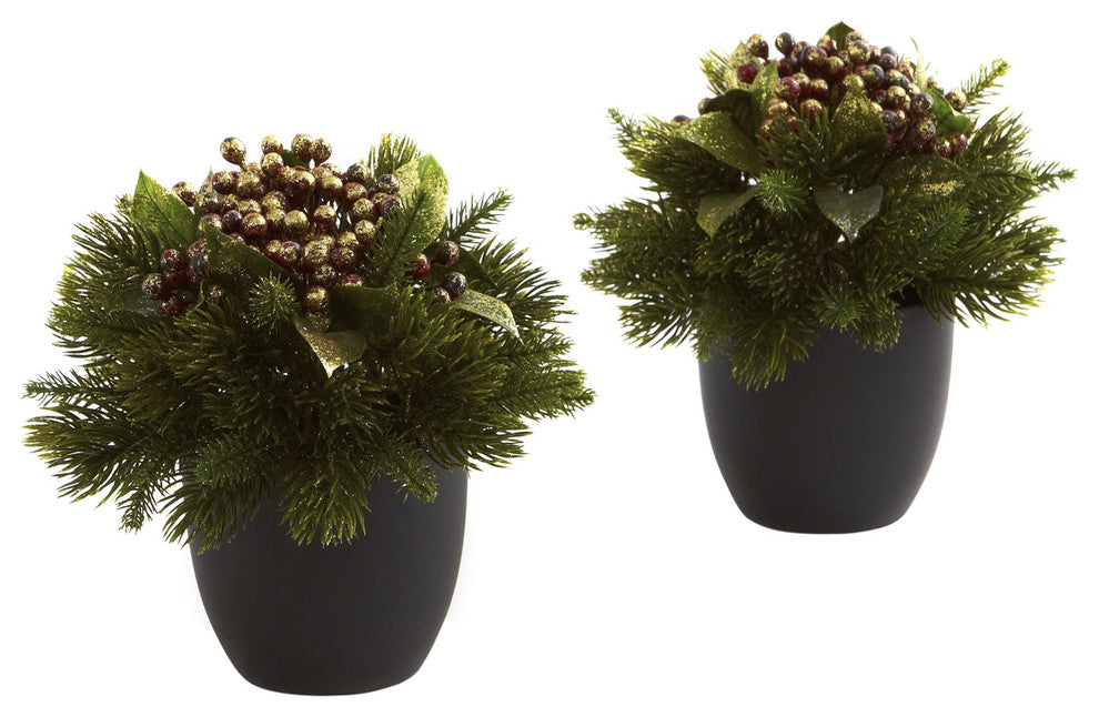 Your holiday decorating just got easier with this beautiful pine and berries mix. With crisp pine, lush berries, leafy greens, all nestled into a beautiful black pot, you''ll have no trouble figuring out where to display it. In fact, we''ll double your options by making this a set of two. Looks great anywhere in your home or office, and makes an ideal gift as well.
