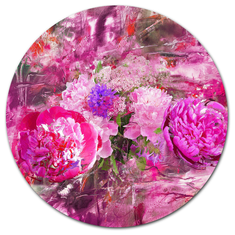 Bring Contemporary Abstraction to your home with this large Circle Metal wall art. This Pink Peonies Abstract Background Metal Artwork makes it the focal point of any room or office.