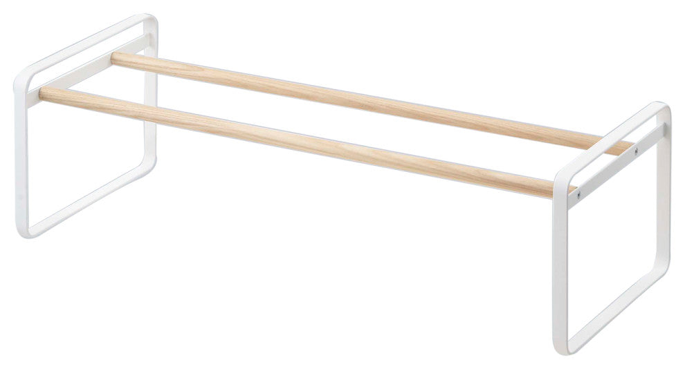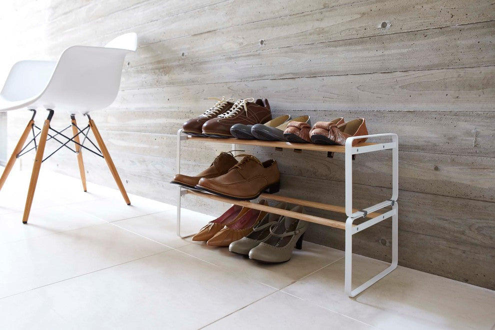 An open steel frame and warm wooden accents combine in an attractive and modern shoe organizer aesthetic. This simply designed shoe rack is stackable to ensure maximum capacity. Each rack holds up to six pairs of shoes. Stack them on top of each other to double or triple shoe storage space. Steel clips keep the frames securely in place.