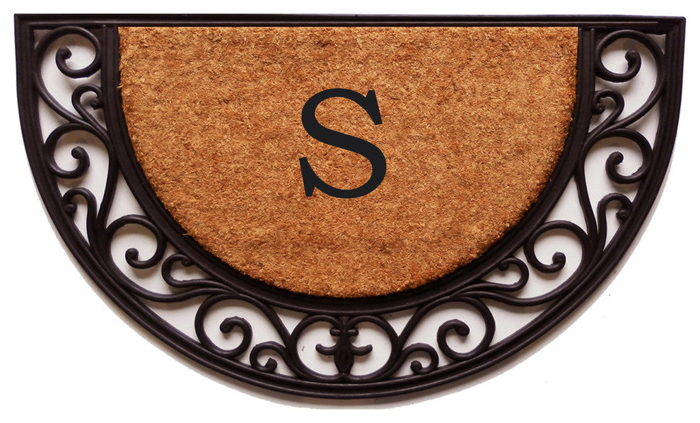 The beautiful combination of coir and rubber in this arch doormat make an attractive, yet durable reception for your guests. Heavy-duty rubber adds weight to this elegant monogrammed mat while the coir absorbs moisture and acts as a natural scraper on shoes. Weather tolerant and colorfast, this doormat can be easily maintained by vacuuming, sweeping or lightly hosing clean and allowing to dry.