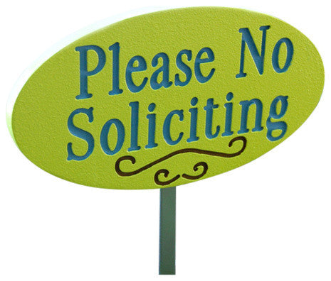 Product Details:Are you getting pesky solicitors at your door? This sign politely lets them know that you''re not interested."Please No Soliciting" is engraved on an oval wood plaque and painted in lime green with the engraving painted blue and design in dark brown.The sign comes with a steel stake that extends 7" from the bottom of the sign. This sign looks great placed in a planter or staked in the walkway grass. The sign measures 9" long, 5" wide and is cut from 1/2 wood. All of my signs are engraved on outdoor grade sign wood that is resin coated to keep the wood from splintering or fading. I hand paint each sign with 2-3 coats of exterior paint and seal with a UV protectant, weather resistant sealer on both the front and back of the sign.