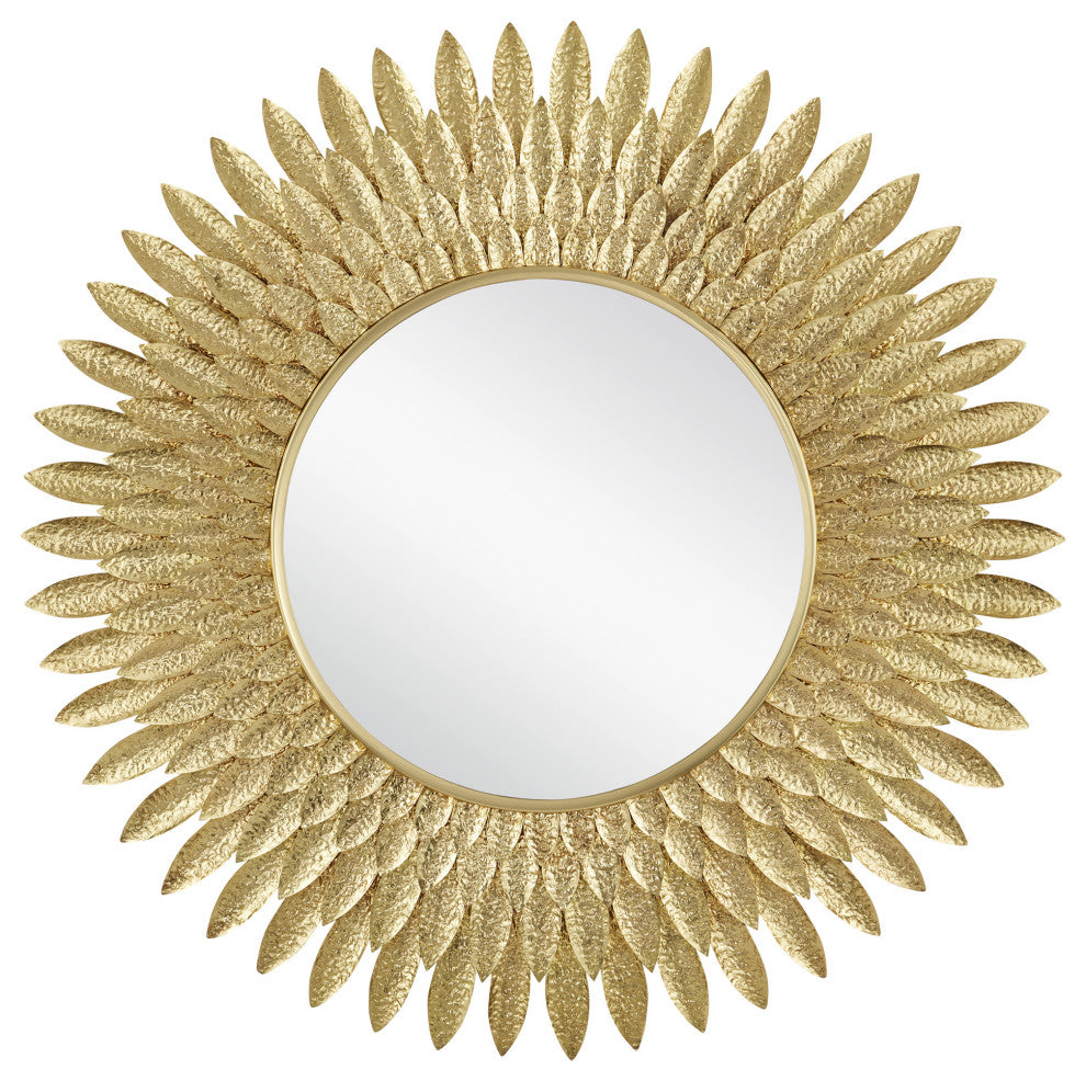 A beautiful burst of brass feathers, the Plume Round Mirror is a remarkably artistic creation, with each of the hundreds of hand-cut and hand-hammered faux feathers affixed to the frame one after another by artisan hand. The rows graduate from largest to the smallest as they move toward the mirrored glass.