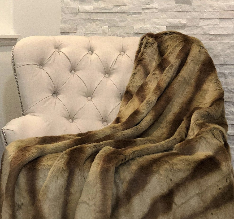 Indulge yourself with cozy and luxurious comfort of this exotic chichilla faux fur blanket in beige, tan and gold-ish brown colors. This chichilla fur has short pile and is incredibly soft and plush with super microfiber backing. Available in different sizes. • Handmade in the USA
