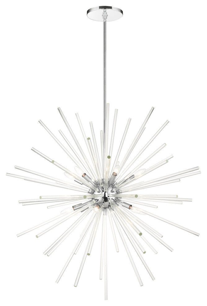 The Utopia twelve light foyer pendant chandelier will become an attention-grabbing feature in your modern home decor. The polished chrome finish graces the design with elegance and charm, providing a timeless and glamorous quality to any interior. The clear crystal rods give the pendant chandelier a sleek and attractive appearance.