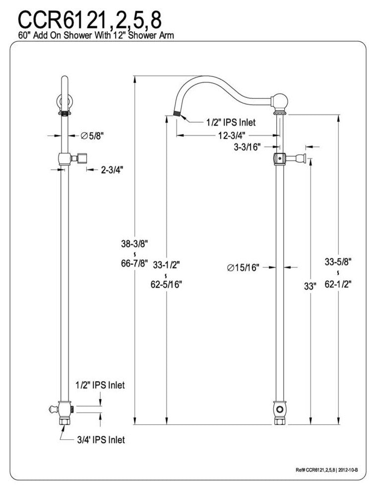 This shower riser and arm is constructed of high quality brass to ensure reliability and durability. Its premier finish resists tarnishing and corrosion.Manufacturer: Kingston BrassModel: CCR6121UPC: 663370115158Product Name: 60" Add on Shower with 12" Shower ArmCollection / Series: VintageFinish: Polished ChromeTheme: ClassicMaterial: BrassType: AccessoriesFeatures: 33-5/8" - 62-1/2" shower riser12" shower armStandard US plumbing connectionsBeautiful premier finishMatching accessories available