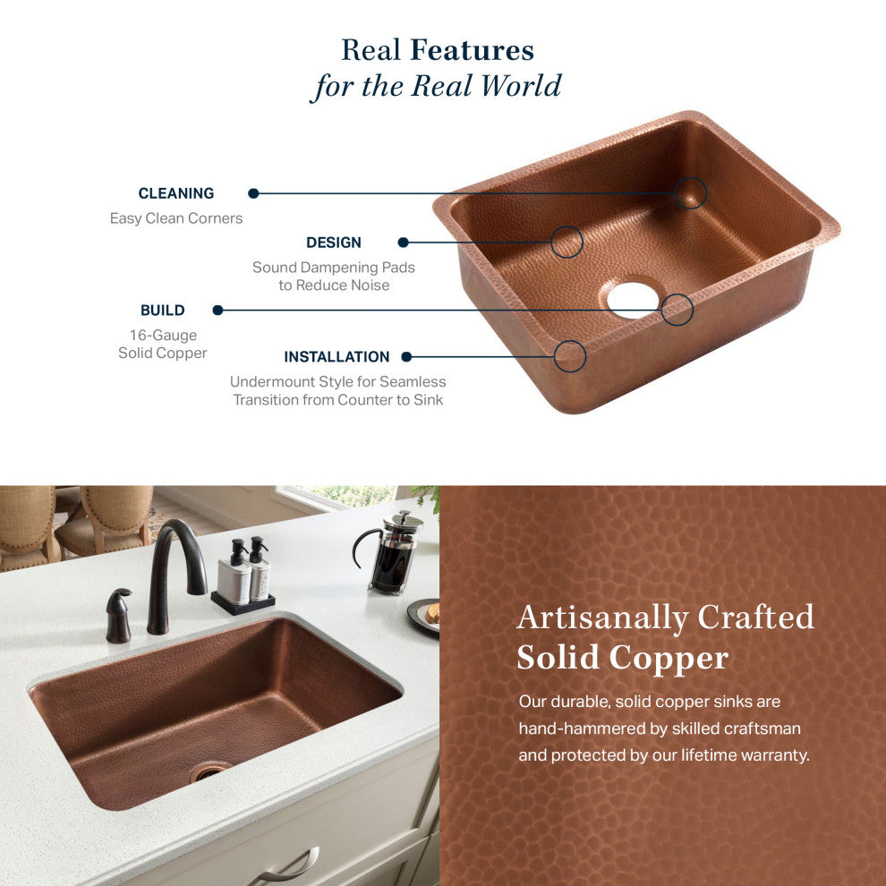 When you''re hosting at the home bar or prepping for a dinner party, you can always use an extra touch of sophistication. The Pollock undermount copper sink is perfect for home entertainment or small spaces. The aged copper finish is unique and beautiful, and makes a big impression on guests. Our durable, solid copper sinks are hand-hammered by skilled craftsman and protected by our lifetime warranty.Dimensions: 12" x 12" x 5"Compact design is perfect for a small kitchen, home bar, laundry room, or tiny homeUndermount style creates a seamless transition from sink to countertop and ensures crumbs and moisture easily go in the sinkSingle bowl maximizes available spaceHand-hammered, solid 18-gauge copper is protected by our lifetime warrantySound dampening pads reduce dish clatter, noise, and vibrationsAged Copper is a warm and vibrant finish with an all-over patinaRecommended Products: Aged Copper Grid Drain (#TG01-AG)Aged Copper Pop-Up Drain (#TP01-AG)Copper Care IQ Kit (#SARMOR-101)