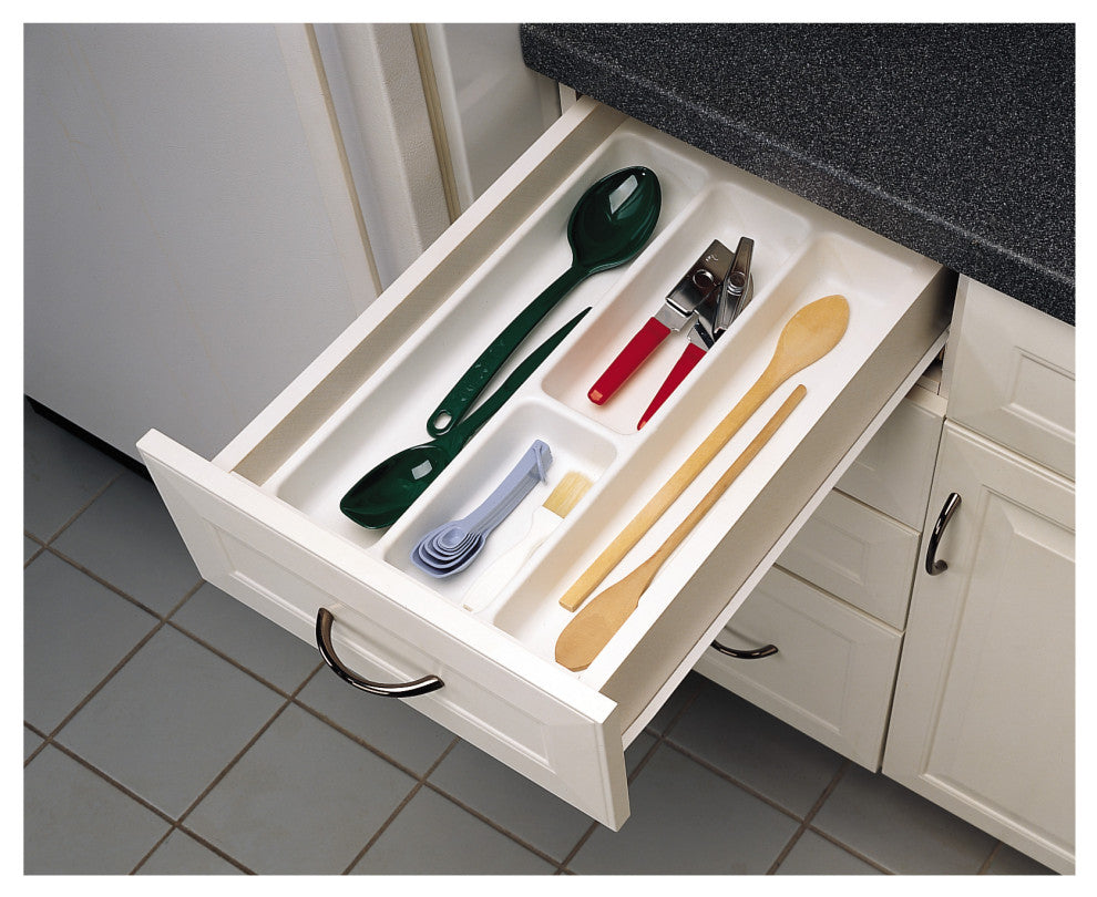 Rev-A-Shelf''s drawer inserts are the best if you are looking for a custom look. Why settle for a cutlery insert that just drops in your drawer and moves every time you open and close your drawer. Create a custom fit by trimming to your exact size. Available in multiple sizes, colors and finishes.-Included: (1) Glossy White utility tray insert-Trim to a custom fit using standard utility knife-Organize kitchen utensils-Trays come with protective film that must be removed after cutting to size-Features a glossy finish-Minimum trim size: 11-5/8" W x 17-3/4" D-Construction: Molded polymer designed for durability-Trays can be trimmed with a sturdy straight edge and utility knife. After trimming, insert trays into drawer. No screws needed.