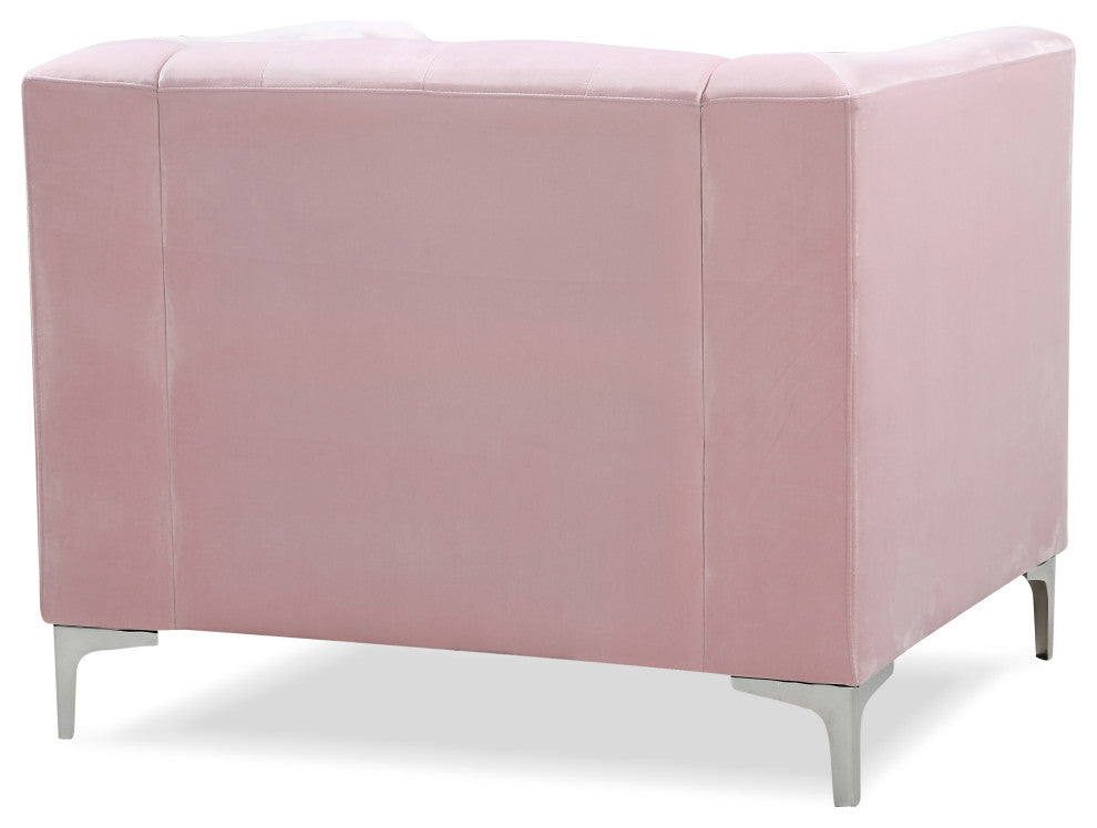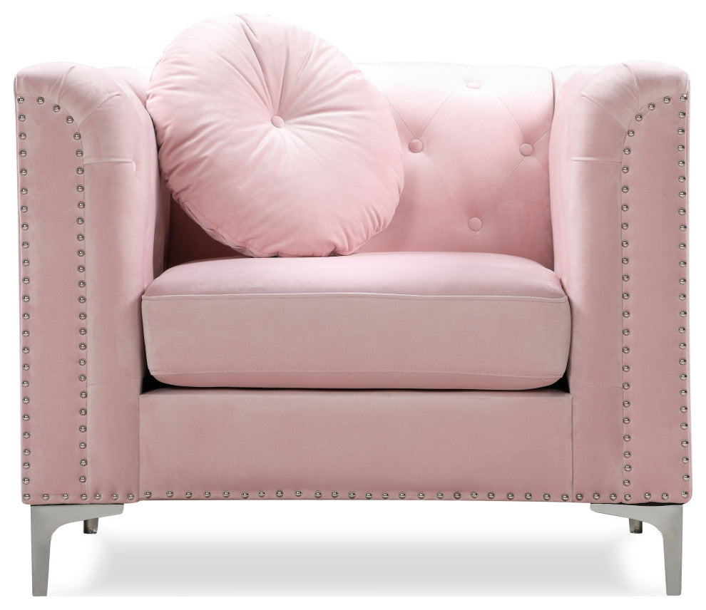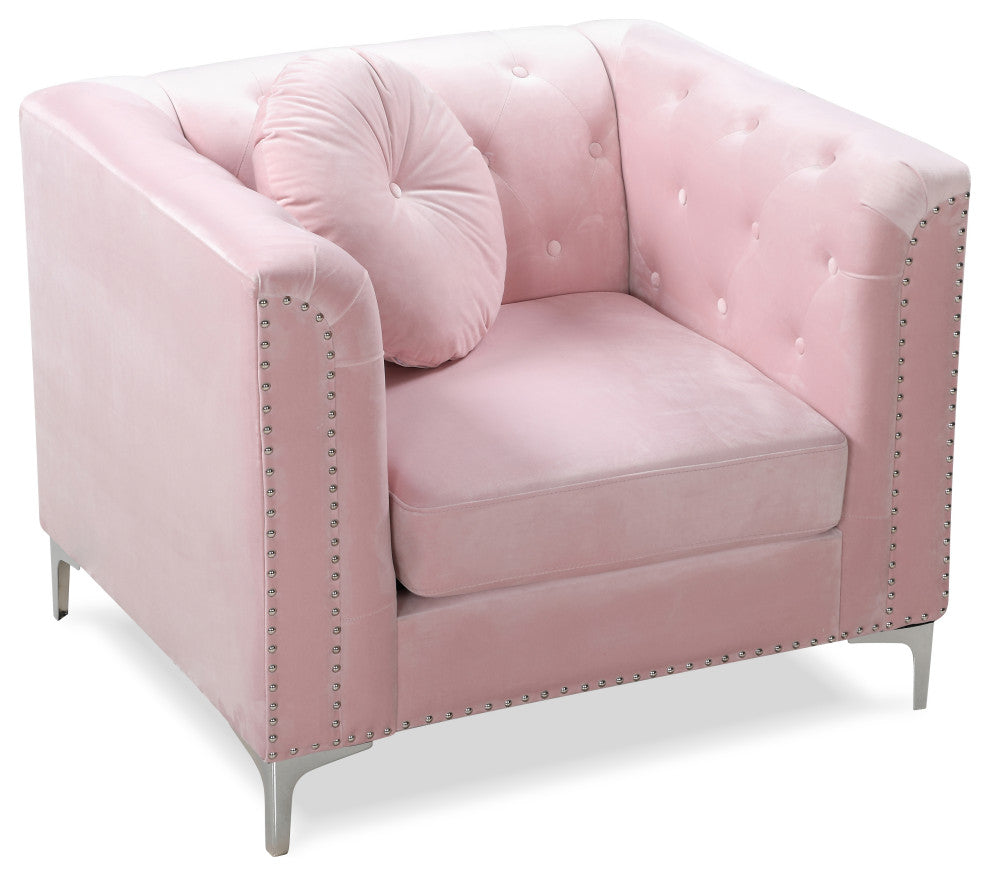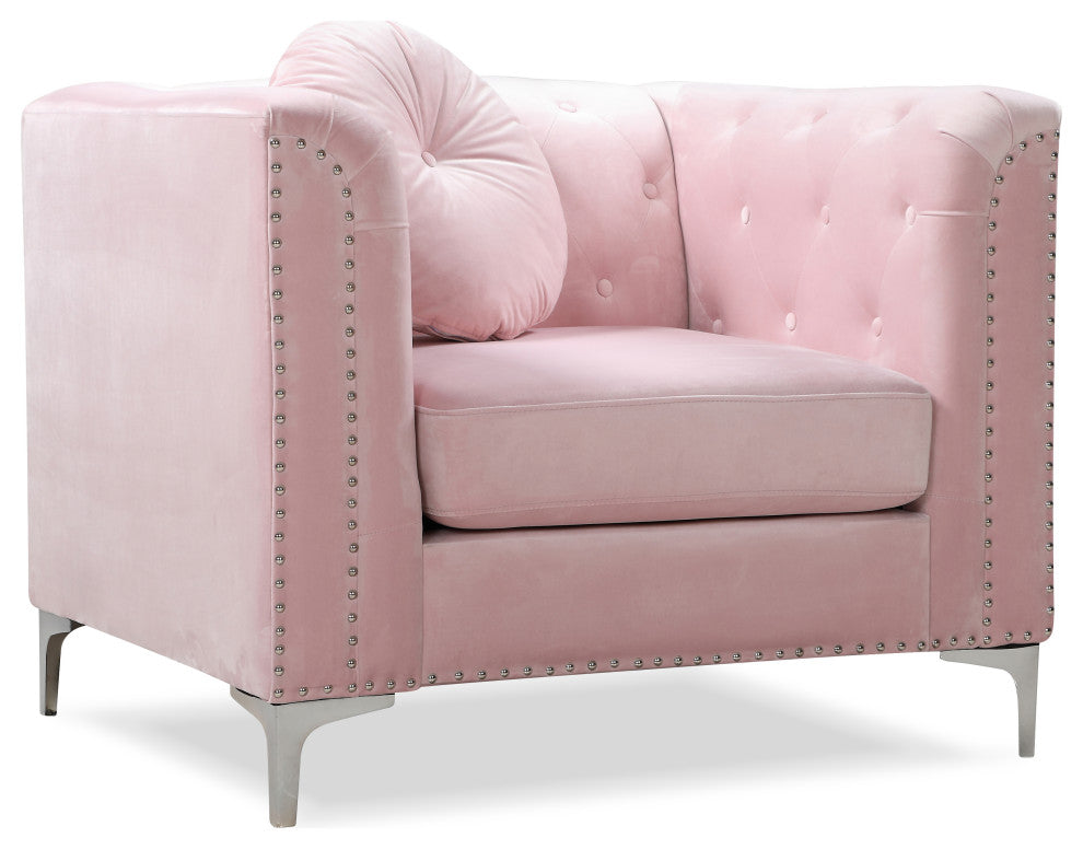 Soft Velvet Button Tufted on the Inside of the Arms and Backs. Pocketed Coil Cushion Seats Make this Set Comfortable and Stylish. Nailhead trimmed and finished off with Chrome Plated Legs , It also includes Round Matching Throw Pillows. KD Design allows for EZ Delivery to any Home or Room! Choose from Sofa. Loveseat Chair Or Reversible Chaise Sectional