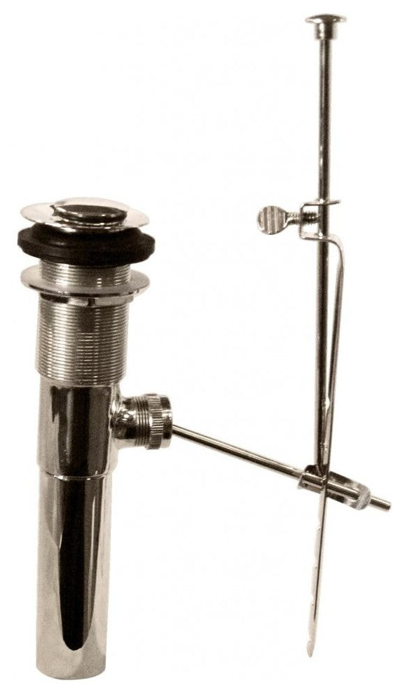This traditional pop-up lavatory drain comes complete with lift rod, extension linkage, horizontal rod. clip and plunger assembly. The drain does not have overflow holes, for sinks without overflow, and has a fully finished body under the sink, for exposed installations. Pop-Up Style Lavatory Drain. Fully Finished for Exposed Installation. Without Overflow Holes. Fits 1-1/2" Opening with 1-1/4" Tailpiece. Brass Construction.