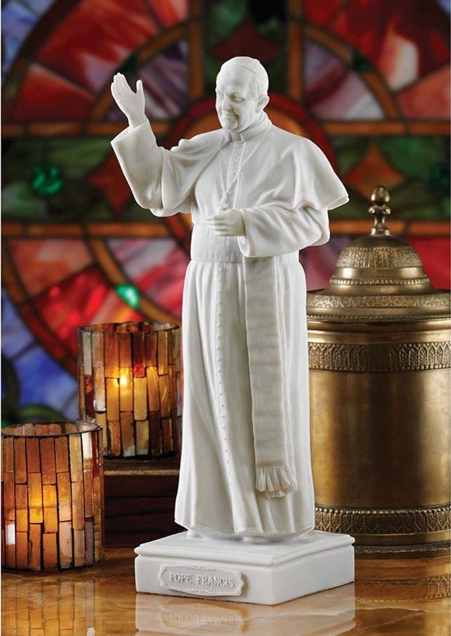 Ordained as pope of the Roman Catholic Church and the first from the Americas, Jorge Mario Bergoglio took his papal title after St. Francis of Assisi of Italy. Pope Francis is known the world over for his great humility and approachability. A true advocator of humility and self-effacement, Pope Francis has been noted for his commitment to serve the poor and needy and to bridge gaps between people of different backgrounds, faiths and beliefs. His motto states: Miserando atque eligendo, which stands for Jesus'' mercy towards sinners. Our Design Toscano Roman Catholic religious statue is lovingly sculpted bestowing a Vatican papal blessing, cast in bonded marble resin, this religious collectible is a stunning piece for any collection. 4"Wx3.5"Dx11"H. 3 lbs.