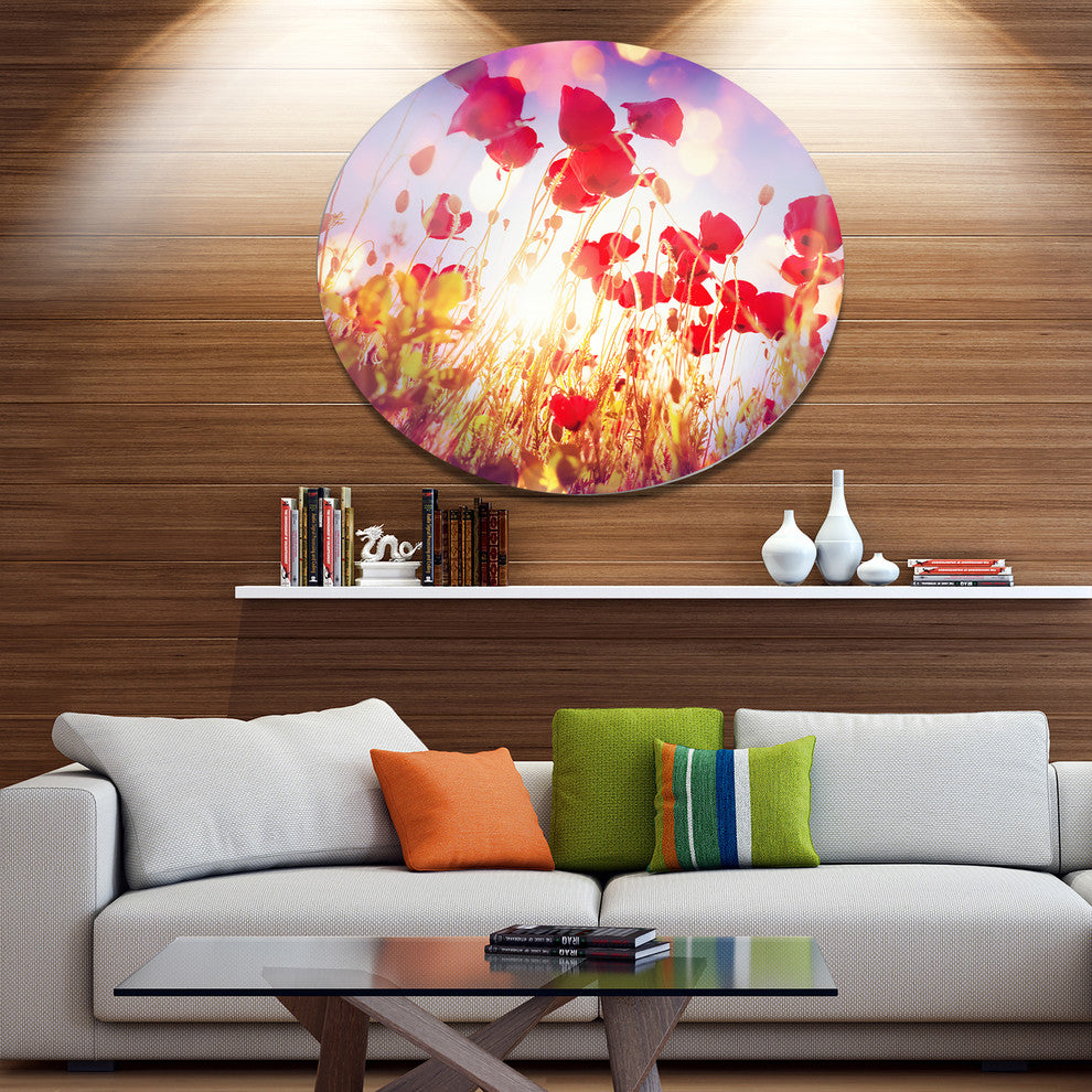 Bring Contemporary Abstraction to your home with this large Circle Metal wall art. This Poppy Flowers on Blue Background Metal Artwork makes it the focal point of any room or office.