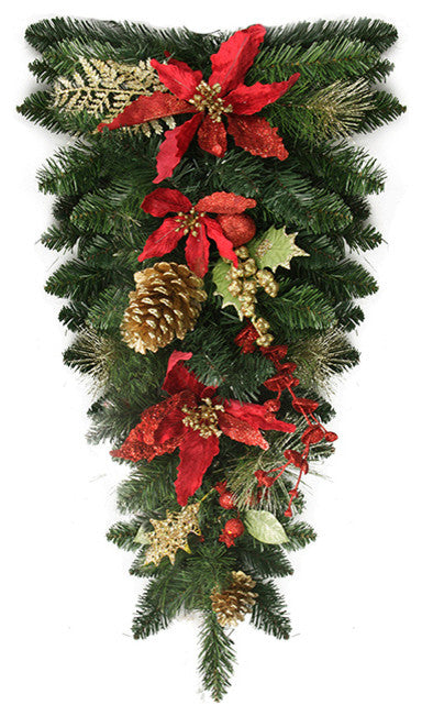 Pre-Decorated Red Poinsettia and Gold Pine Cone Artificial Teardrop Swag, 30"