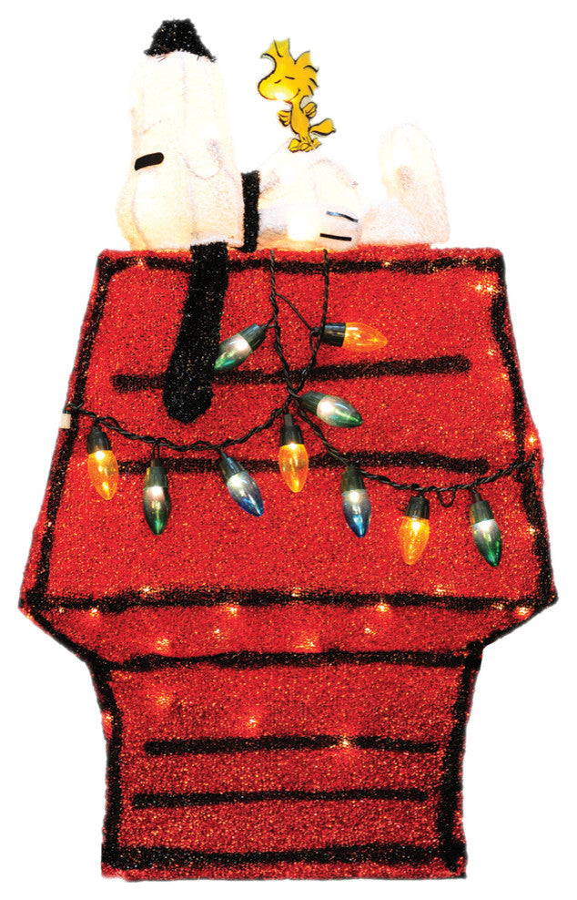 From the Peanuts Collection Officially licensed merchandiseSnoopy is lying on his festively decorated doghouse, covered in Christmas lights If using outdoors, it is recommended that this is placed under a covered areaProduct Features:Pre-lit with clear mini lights Snoopy''s house is draped in a string of clear mini lights with multi-colored C9 bulb covers 34" white lead cord Easy 3-piece assembly, no tools needed Collapsible construction for easy storage Contains 1 plug with end connector allowing you to stack multiple lighted decorations together (not to exceed 210 watts) UL listed for indoor or outdoor use Comes with ground stakes, spare replacement bulbs, and fuses 120 volts, 60 hertz, 0.32 amps, 38.4 wattsDimensions: 26"H x 16.5"W x 4.5"D Material(s): Metal/tinsel/fabric/plastic/glass bulbs/wire