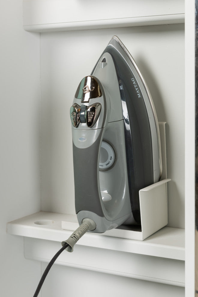 The premium length board coupled with the ventilated top provides an excellent surface for steam ironing. The sturdy double telescoping steel support legs provide for outstanding stability. When finished ironing, you can store the iron while still hot. The oversized iron storage area will hold the majority of irons being sold today. The Hot Iron Rest is the perfect spot to rest a warm iron and prevent scorching when adjusting garments for continued ironing.