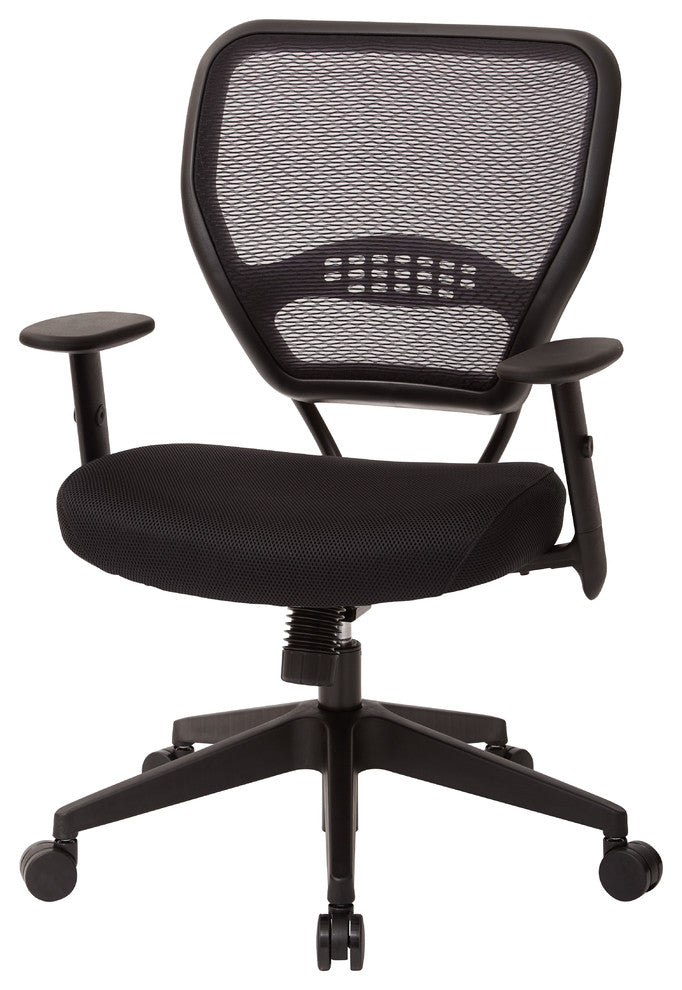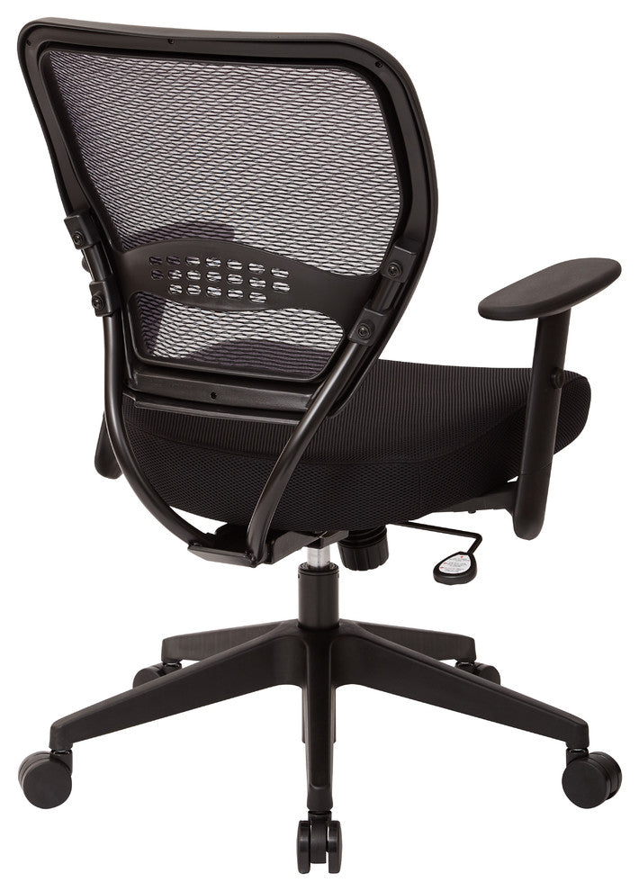 Professional AirGrid Back Managers Chair with Black Mesh Fabric SeatSometimes simple is better and the 5500 basic design is an excellent example of simplicity at its best. It has an open air grid back that conforms to your back for passive ergonomic support. Also features 2-to-1 synchro tilt, pneumatic seat height adjustment and angled adjustable arms. GreenGuard Indoor Air Quality Certified.Features: • Thick Padded Contour Seat and AirGrid • Back with Built-in Lumbar Support • One Touch Pneumatic Seat Height Adjustment • 2-to-1 synchro Tilt Control with Adjustable Tilt Tension • Height Adjustable Angled Arms with Soft PU Pads • Heavy Duty Angled Nylon Base with Oversized Dual Wheel Carpet Casters • Arms to seat height: 6.25" - 9.25" • Arms to floor height: 25.5" - 29.75"Specifications: • Chair Dimensions: 26.5"W x 25.25"D x 42.25"H • Chair Weight: 33 lbs • Chair Weight Capacity: 275 lbs • Seat Dimensions: 20.5"W x 19.5"D x 3.5"T • Seat Height: 18.75" - 23" • Back Dimensions: 20.5"W x 18.5"H