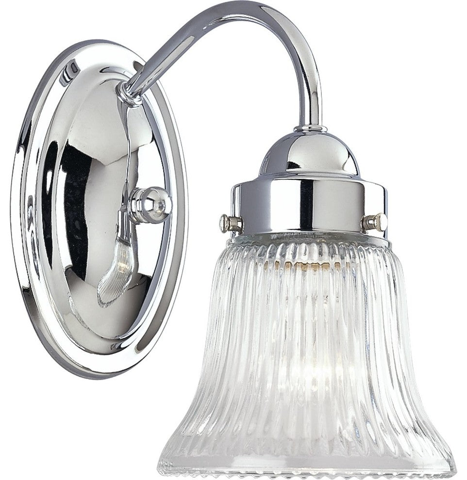Fluted Glass 1-light bath fixture in a Chrome finish. Classic metallic fixture is paired with sparkling clear prismatic glass. Timeless in its vintage appeal, this light is stylish for both new and restored homes.Finish: Polished ChromeBulb Type: Uses Medium BaseBulb Wattage: 100Bulb Quantity: 1Listed: Damp location listedMount Type: WallStyle: Traditional/ClassicFeatures: ChromeClear, sparkling prismatic glassFinely ribbed glass shadeStrongly defined scroll armRoom Type: Bathroom Lighting and/or Hall & Foyer LightingDimensions: Width/Diameter: 5-1/4"Height: 8-1/4"Specifications:Mounting: Wall mountedMounting strap for outlet box includedMounts in up or down positionBack plate covers a standard 4 hexagonal recessed outlet box4-1/4 W., 6-1/8, 1-3/16Electrical:Pre-wired6 of wire supplied120VLamping:Quantity: 1100W Medium BaseMedium ceramic socketAdditional Information:UL-CUL Damp location listed1 year warrantyCompanion fixtures are available
